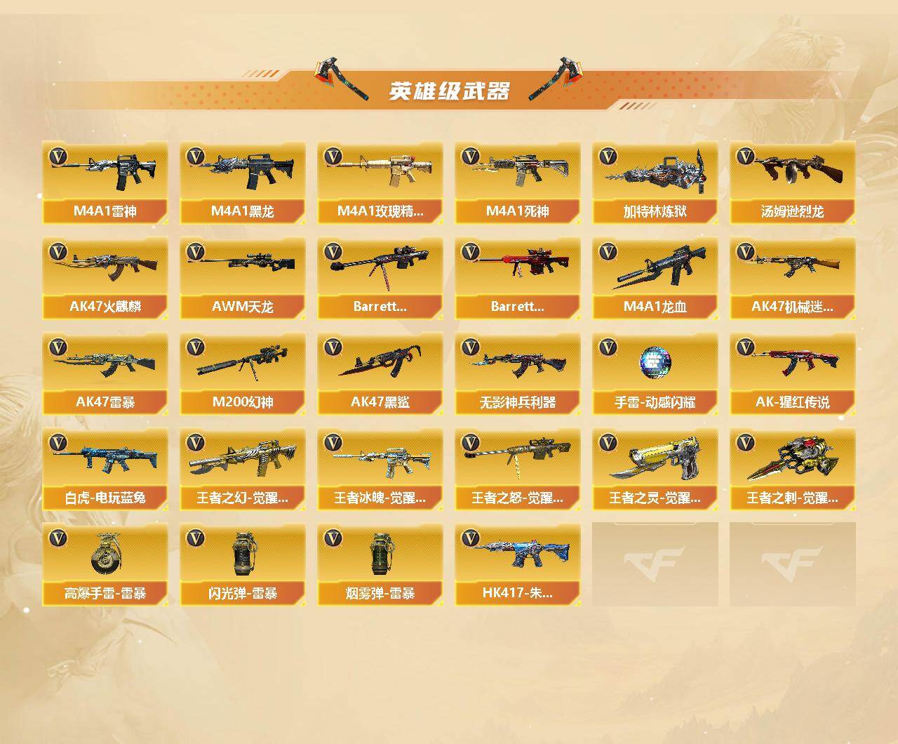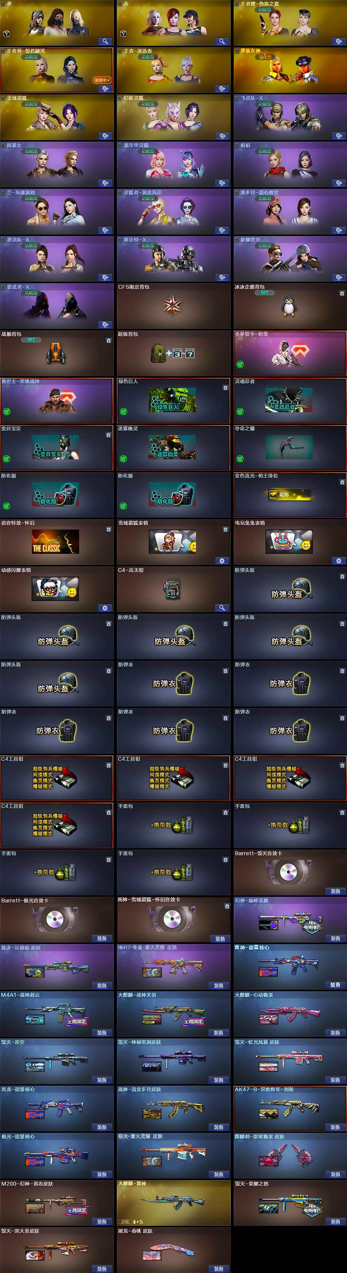 【皮肤】:M200-幻神-黄忠皮肤,幻神-巅峰荣耀,裁决-运输船 皮肤,雷神-能量核心,M4A1-战神赵云,火麒麟-雷神,火麒麟-战神关羽,火麒麟-心动糖果,毁灭-荣耀之怒,毁灭
