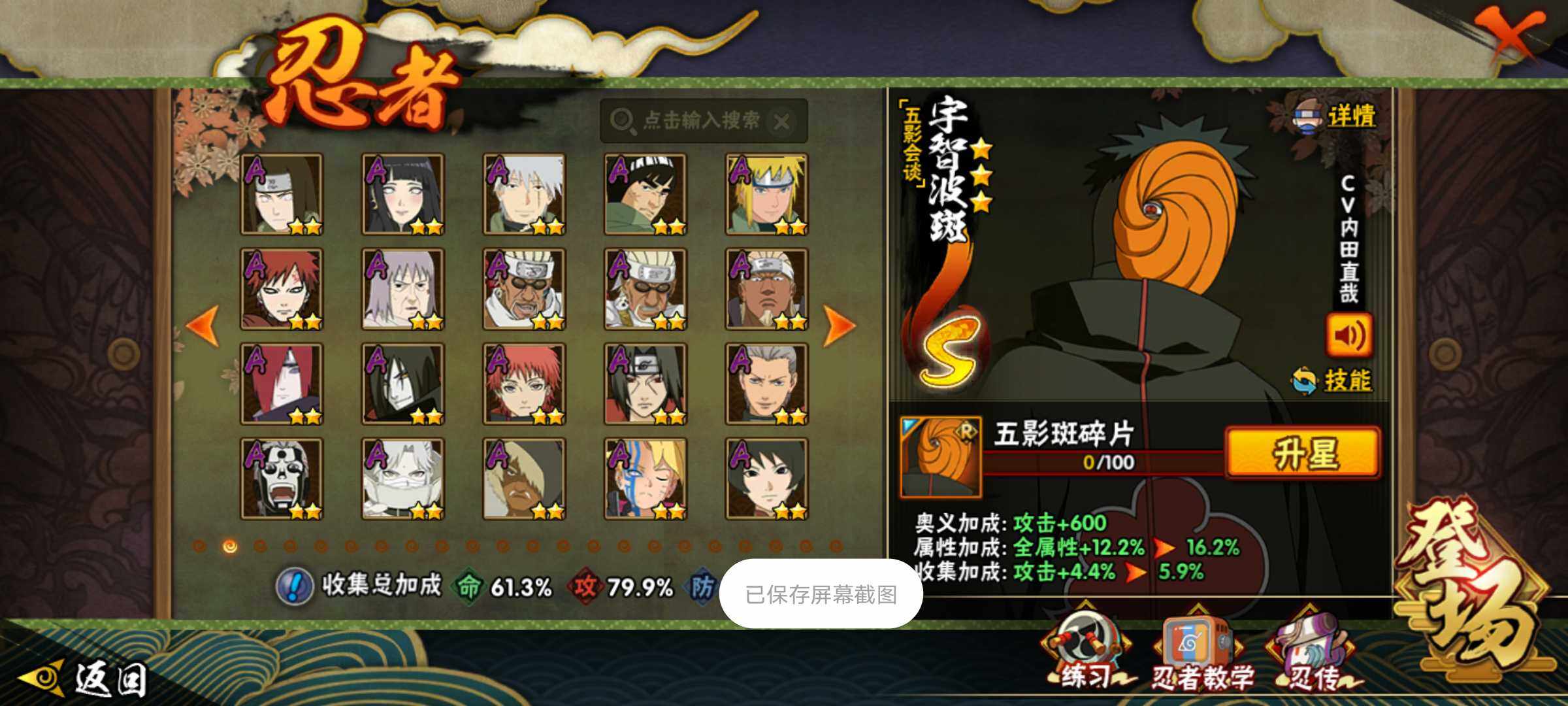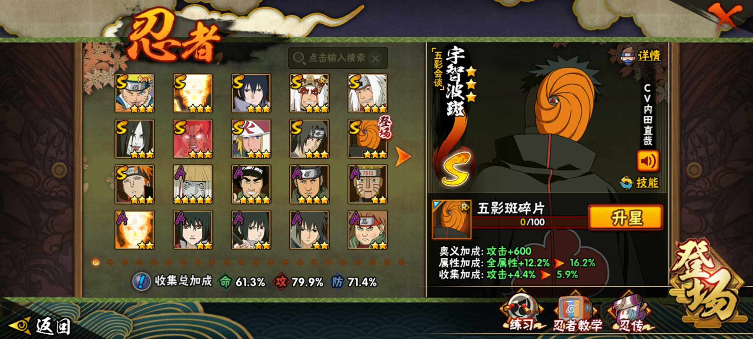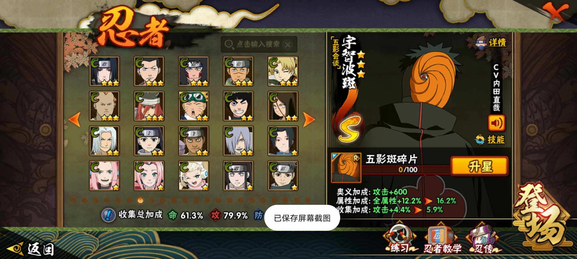 【S级忍者】:宇智波鼬「须佐能乎」(3星),自来也「舞之豪杰」(3星),大蛇丸(3星),自来也「传说中的三忍」(3星),波风水门(3星),漩涡鸣人「九喇嘛连结」(3星),迈特凯「死门」(3星),佩恩「天道」(3星),宇智波佐助「永恒万花筒」(3星),宇智波斑「五影会谈」(3星),漩涡鸣人·宇智波佐助(3星)