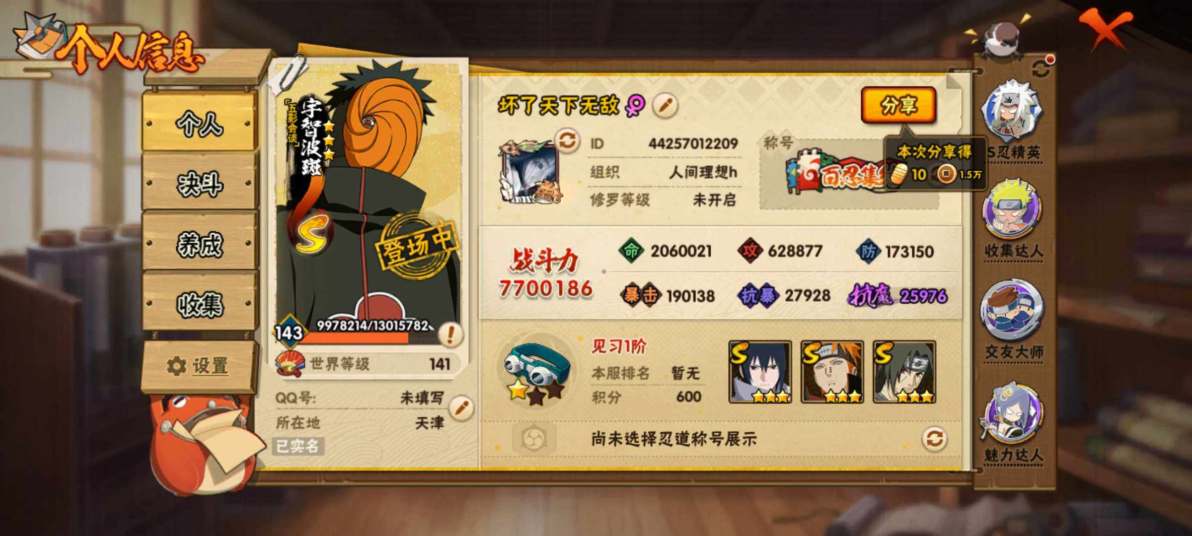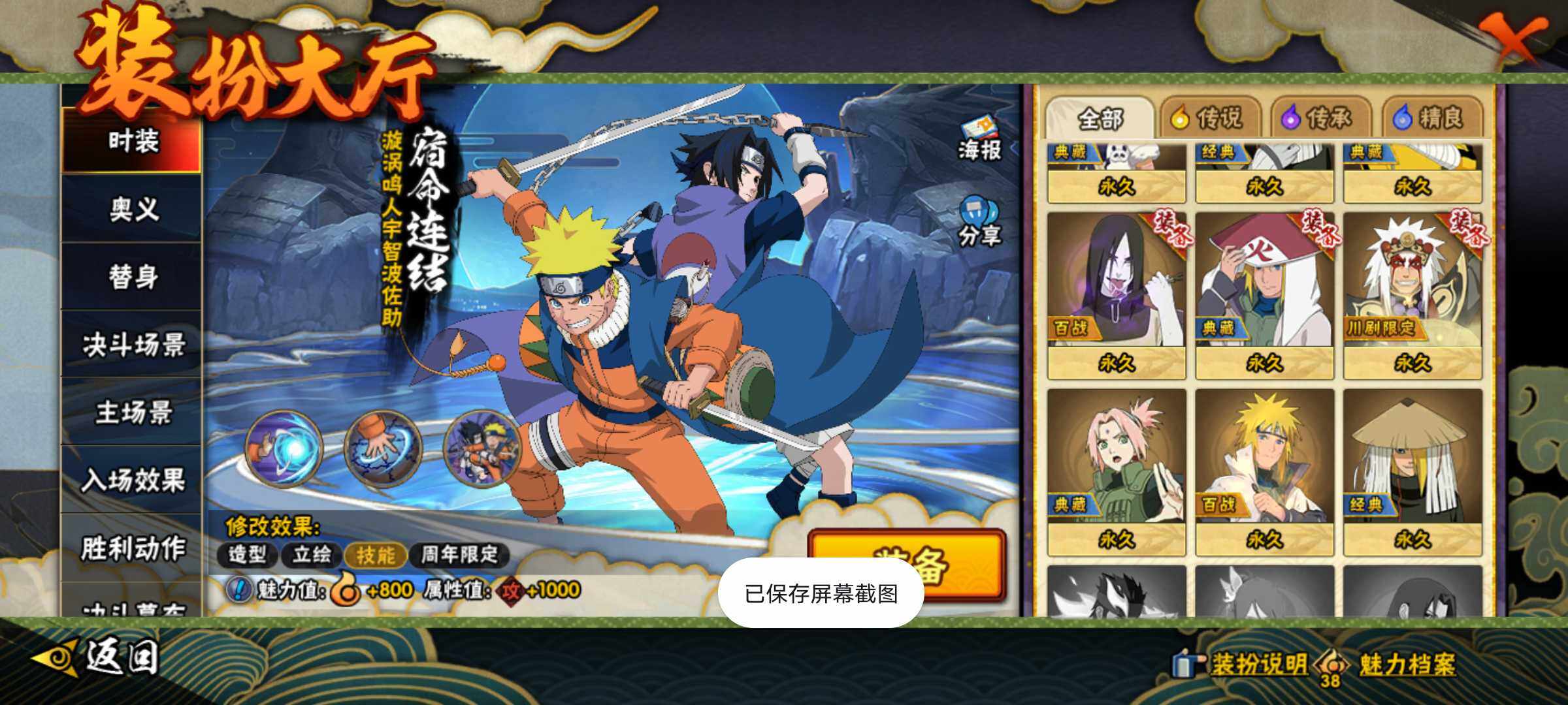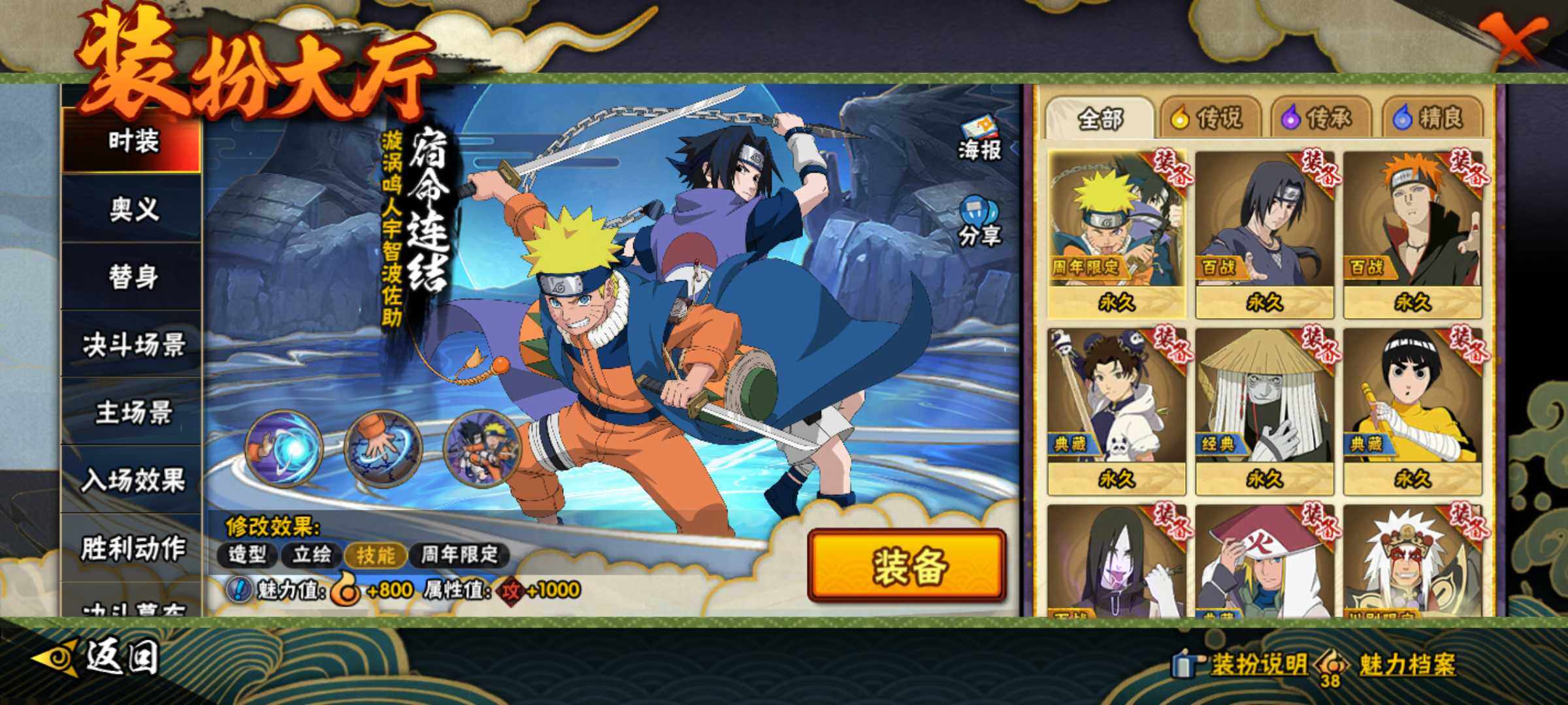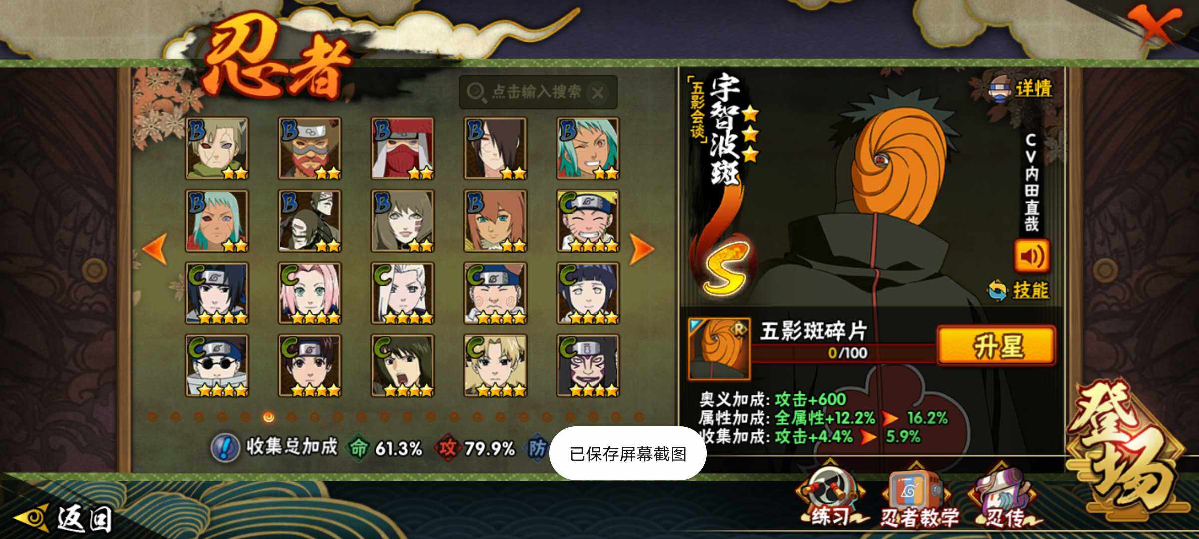 【S级忍者】:宇智波鼬「须佐能乎」(3星),自来也「舞之豪杰」(3星),大蛇丸(3星),自来也「传说中的三忍」(3星),波风水门(3星),漩涡鸣人「九喇嘛连结」(3星),迈特凯「死门」(3星),佩恩「天道」(3星),宇智波佐助「永恒万花筒」(3星),宇智波斑「五影会谈」(3星),漩涡鸣人·宇智波佐助(3星)