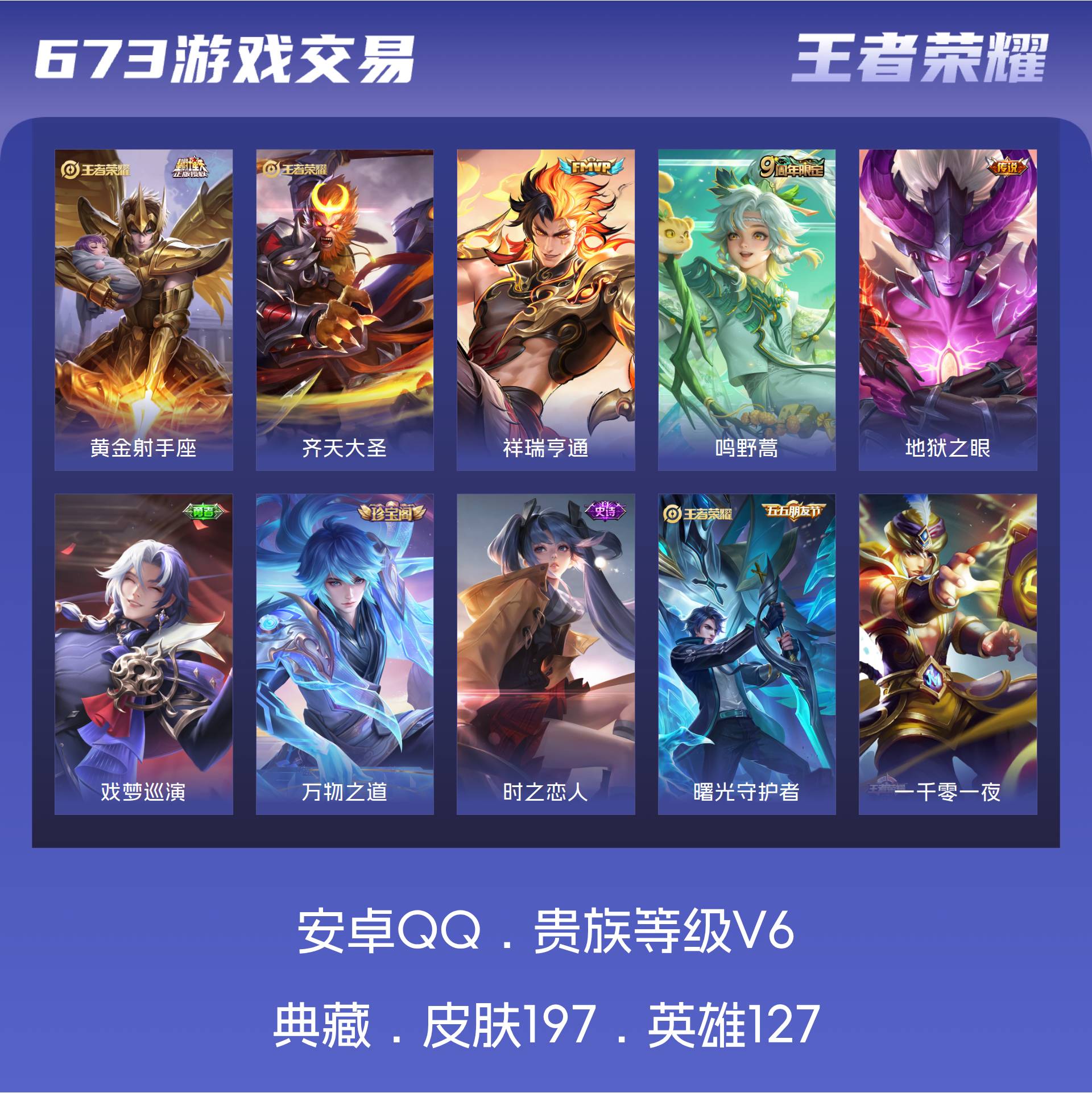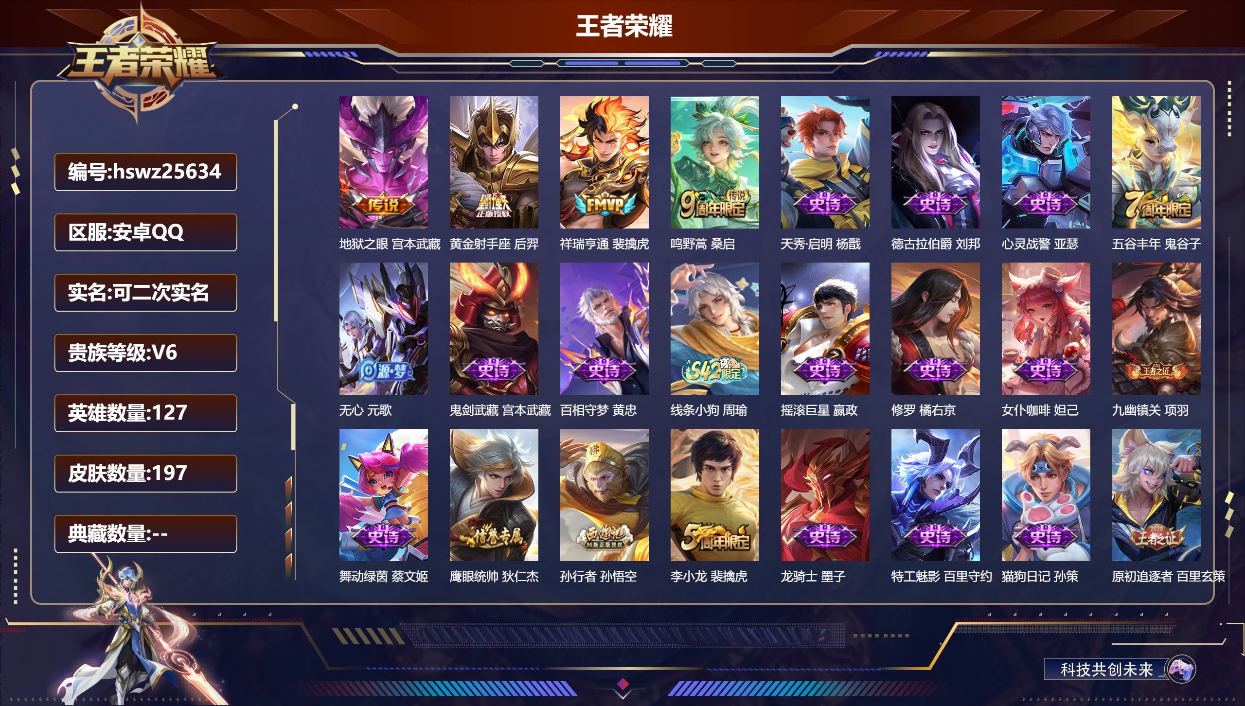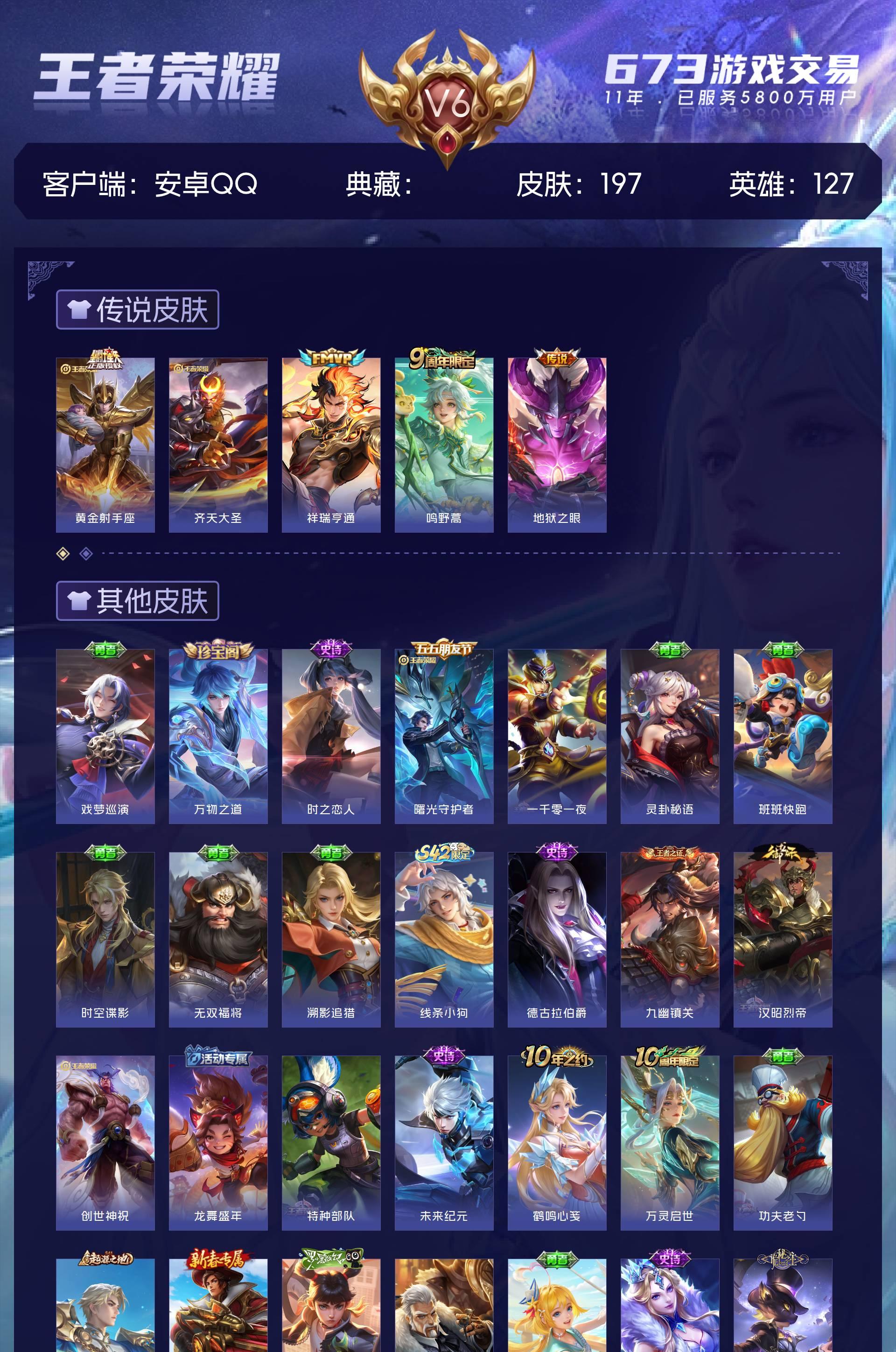 安卓QQ/至圣王者/197皮肤/127英雄/0典藏/0珍品无双/0无双/0珍品传说/4传说/47史诗