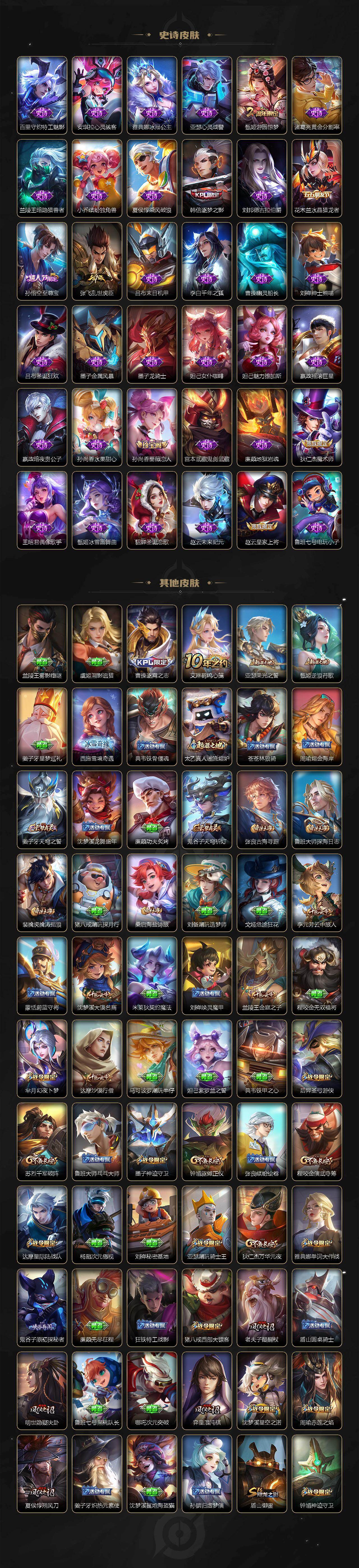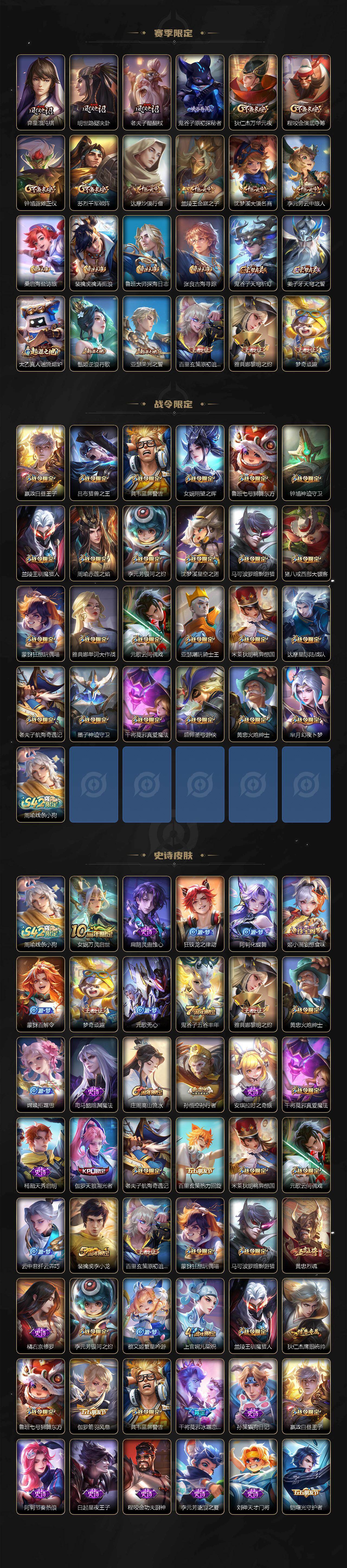 【限定皮肤】:姜子牙天穹之誓,狄仁杰阴阳师,赵云皇家上将,墨子神迹守卫,嬴政白昼王子,孙尚香蔷薇恋人,鲁班七