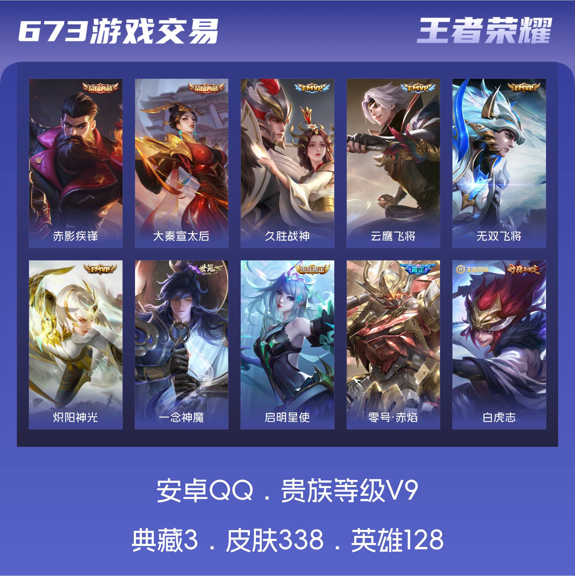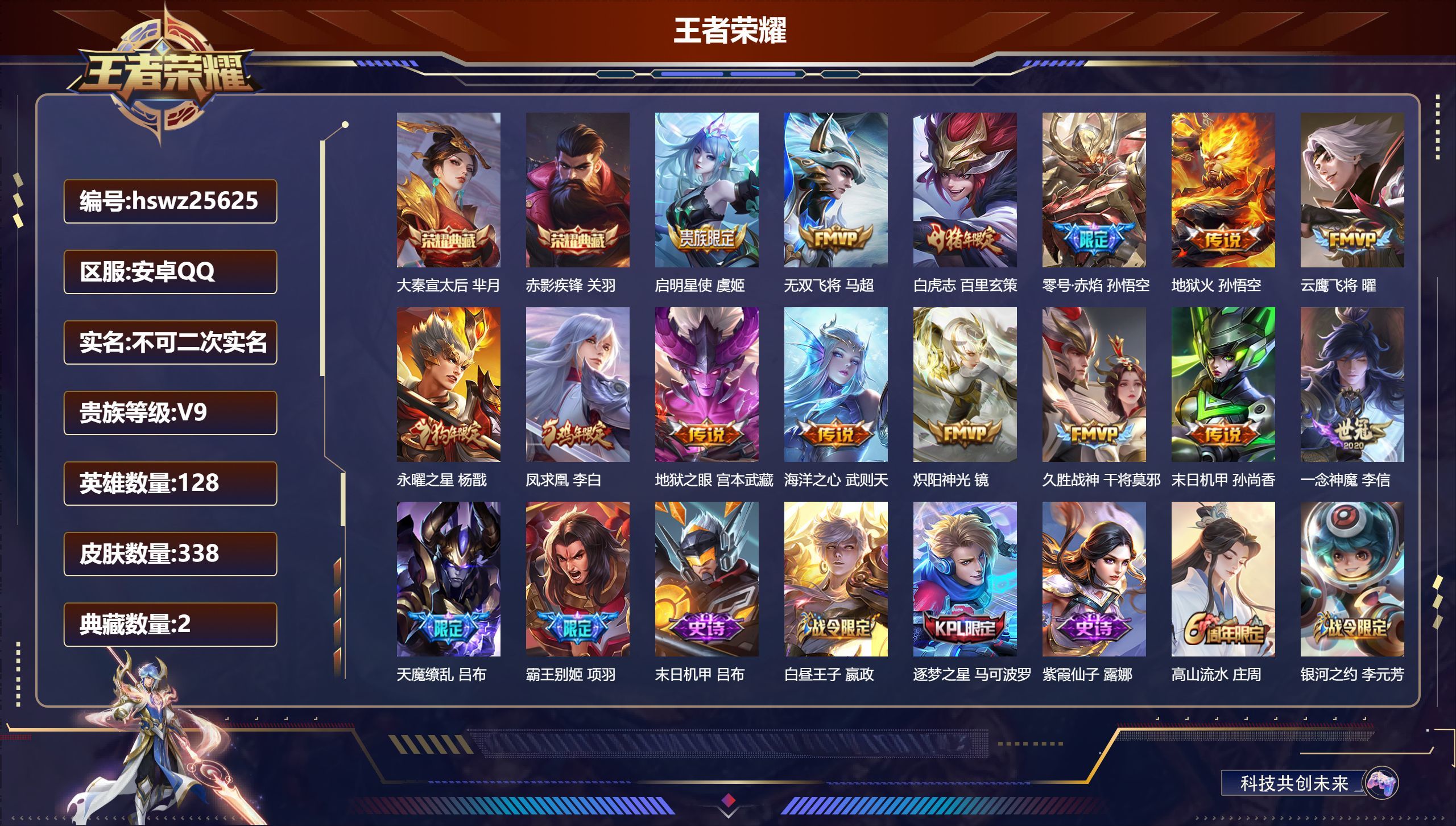 安卓QQ/绝世王者/338皮肤/128英雄/2典藏/0珍品无双/0无双/0珍品传说/15传说/96史