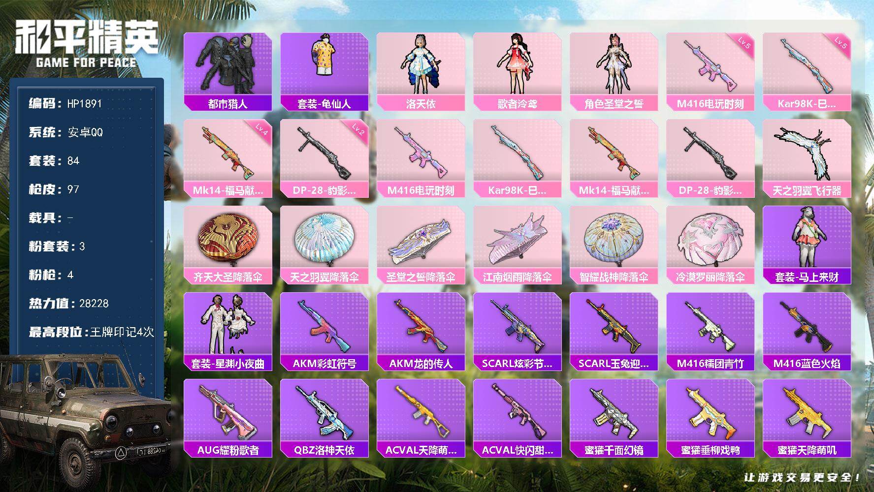 【HP1891】84套装/枪械4/装备110/战备74/王牌印记4/热力值28228/五级M416-电玩时刻/五级Kar98K-巳巳如意/四级Mk14-福马献瑞/二级DP-28-豹影疾电/套装-都市猎人/套装-龟仙人/角色-洛天依/角色-歌者泠鸢/角色-圣堂之誓/M416-电玩时刻/Kar98K-巳巳如意/Mk14-福马献瑞/DP-28-豹影疾电/天之羽翼飞行器/齐天大圣降落伞/天之羽翼降落伞/圣堂之誓降落伞/江南烟雨降落伞/智耀战神降落伞/冷漠罗丽降落伞/套装-马上来财/套装-星渊小夜曲/AK