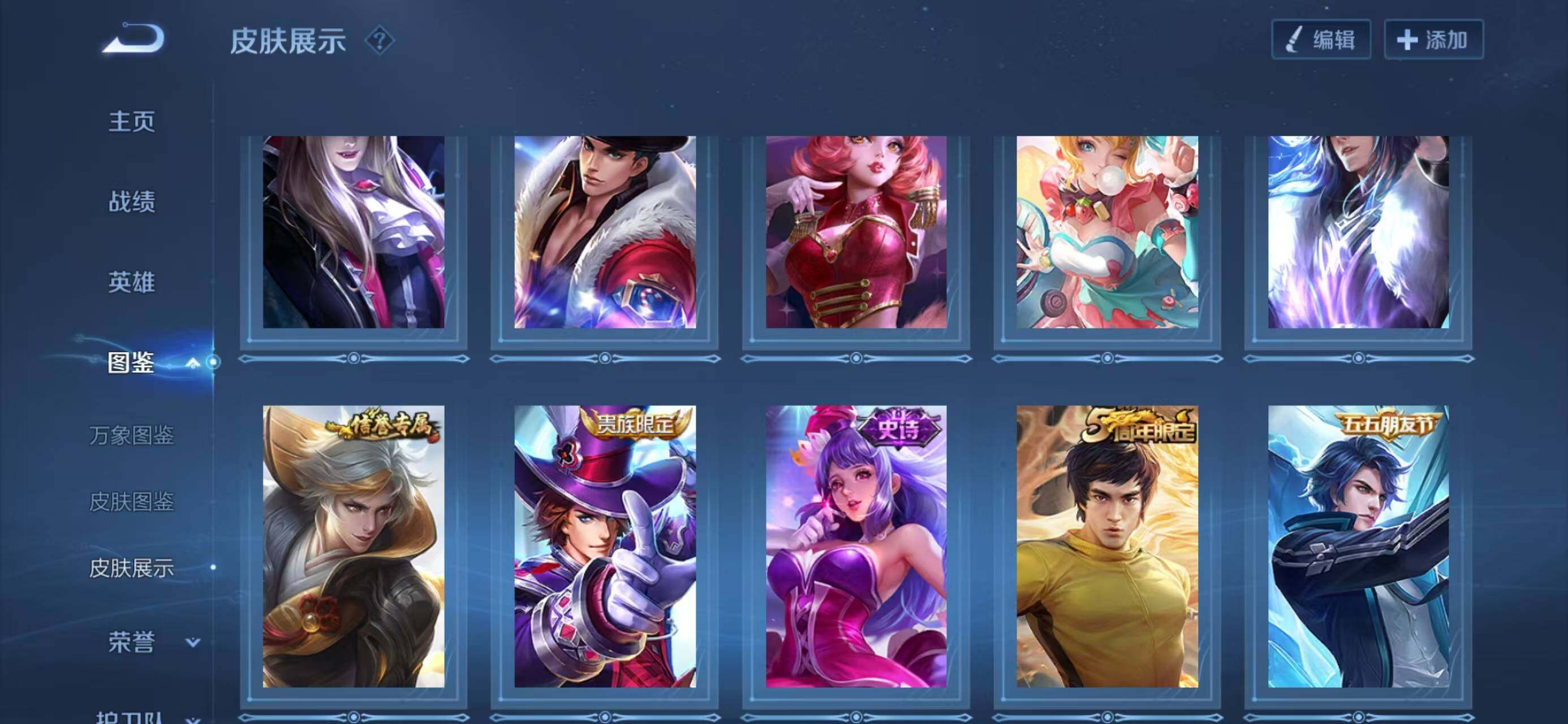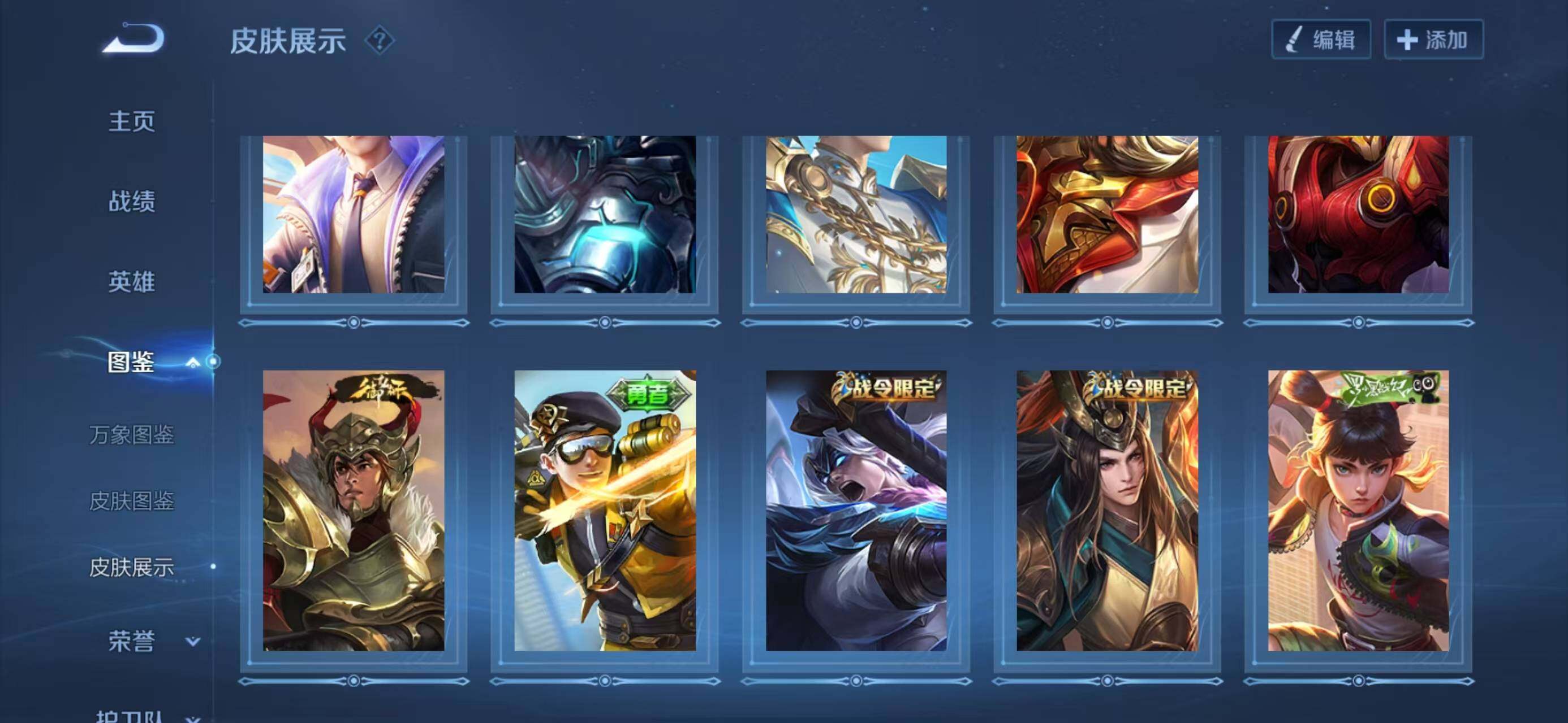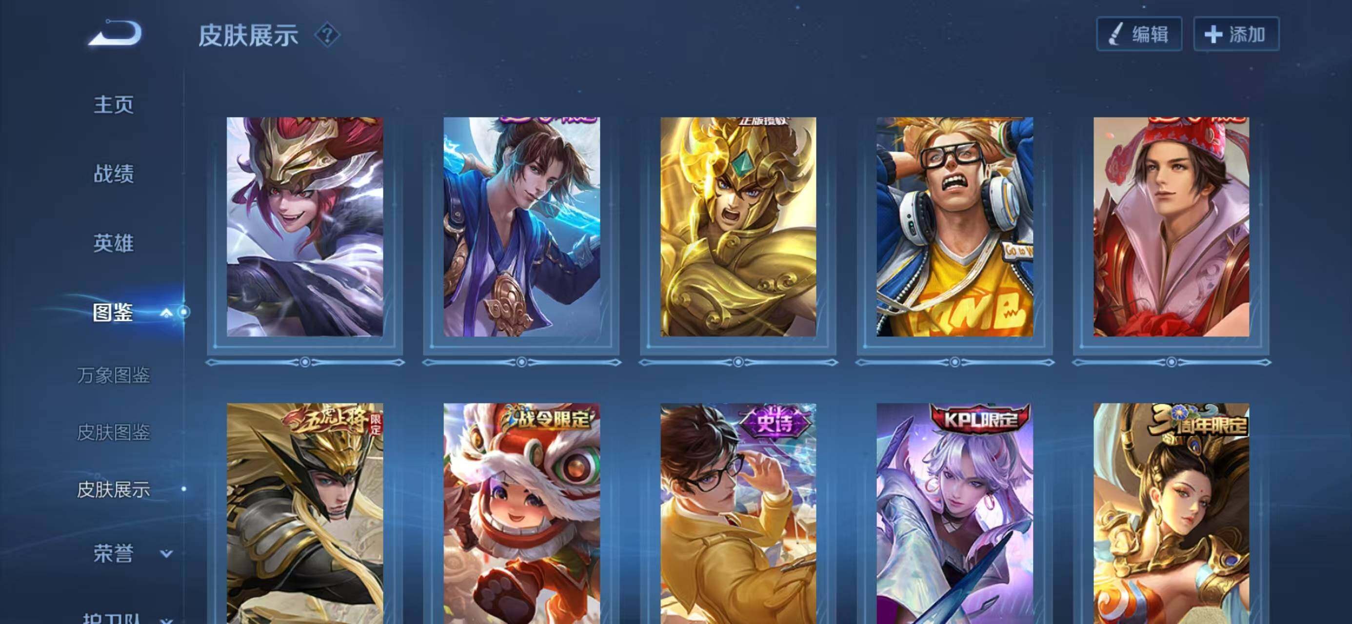 【限定皮肤】:白起狰,狄仁杰阴阳师,赵云皇家上将,鲁班七号狮舞东方,吕布猎兽之王,周瑜赤莲之焰,夏侯惇朔风刀,典韦穷奇,典韦蓝屏警告,狄仁杰魔术师,狄仁杰万华元夜,项羽海