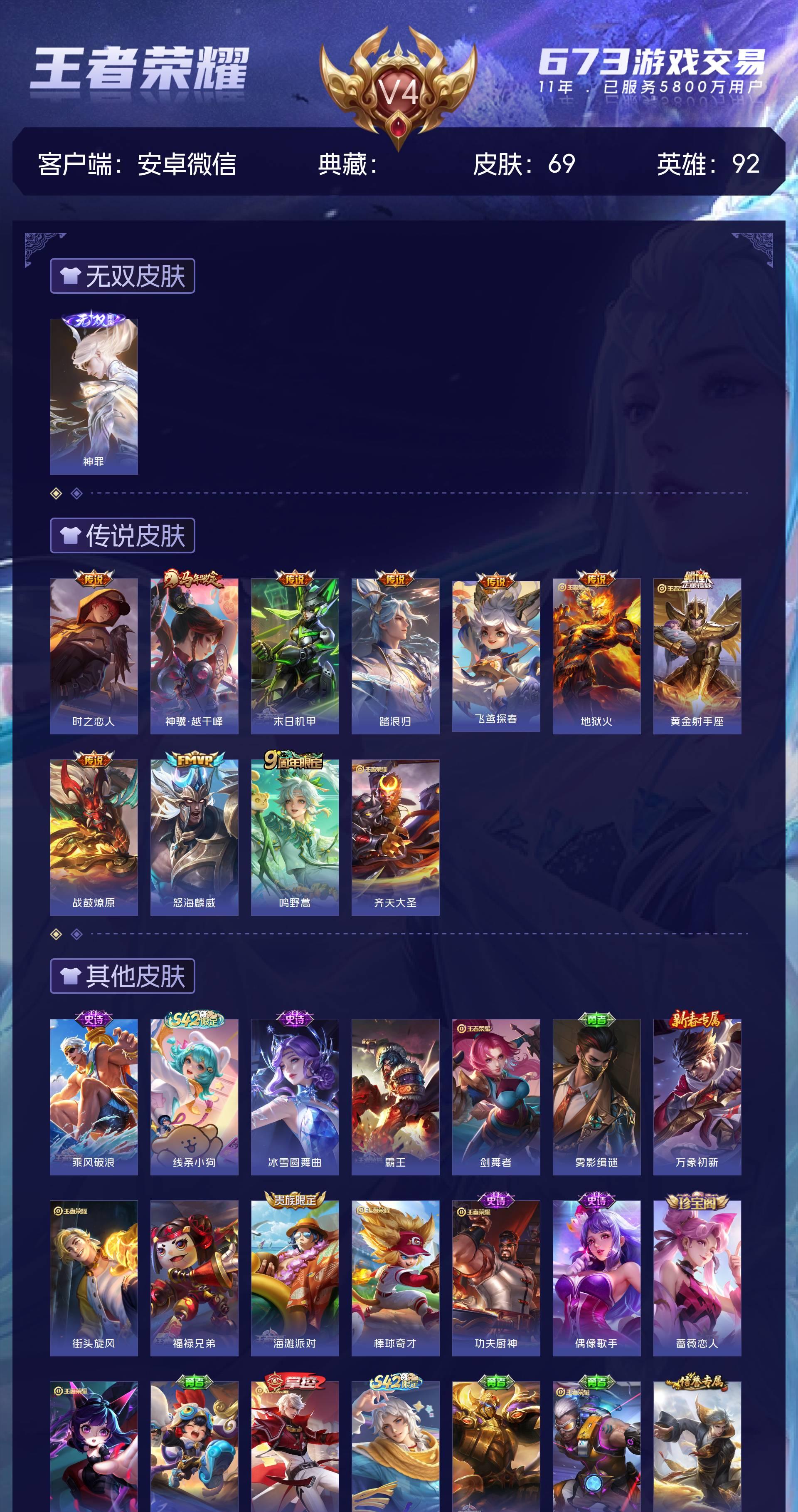 V4 皮肤69 英雄92 荣耀王者 无双皮肤1 传说11 其他皮肤64