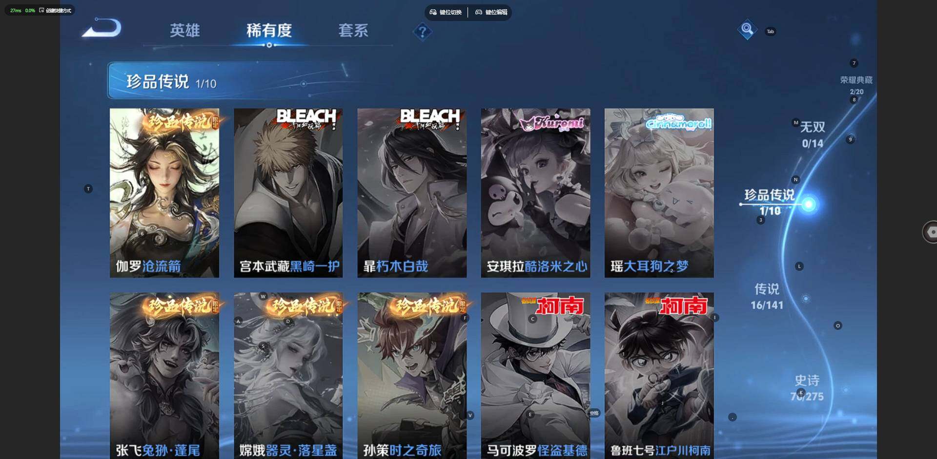 实名: 可修改 贵族等级: V7 英雄数: 127 皮肤数: 248 荣耀水晶
