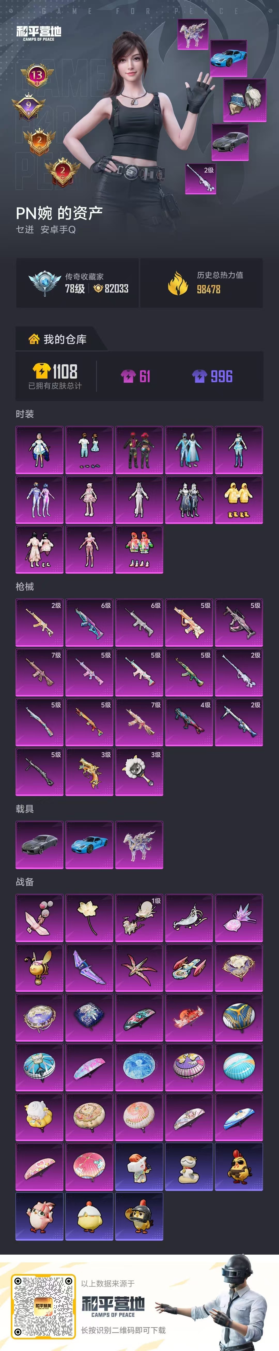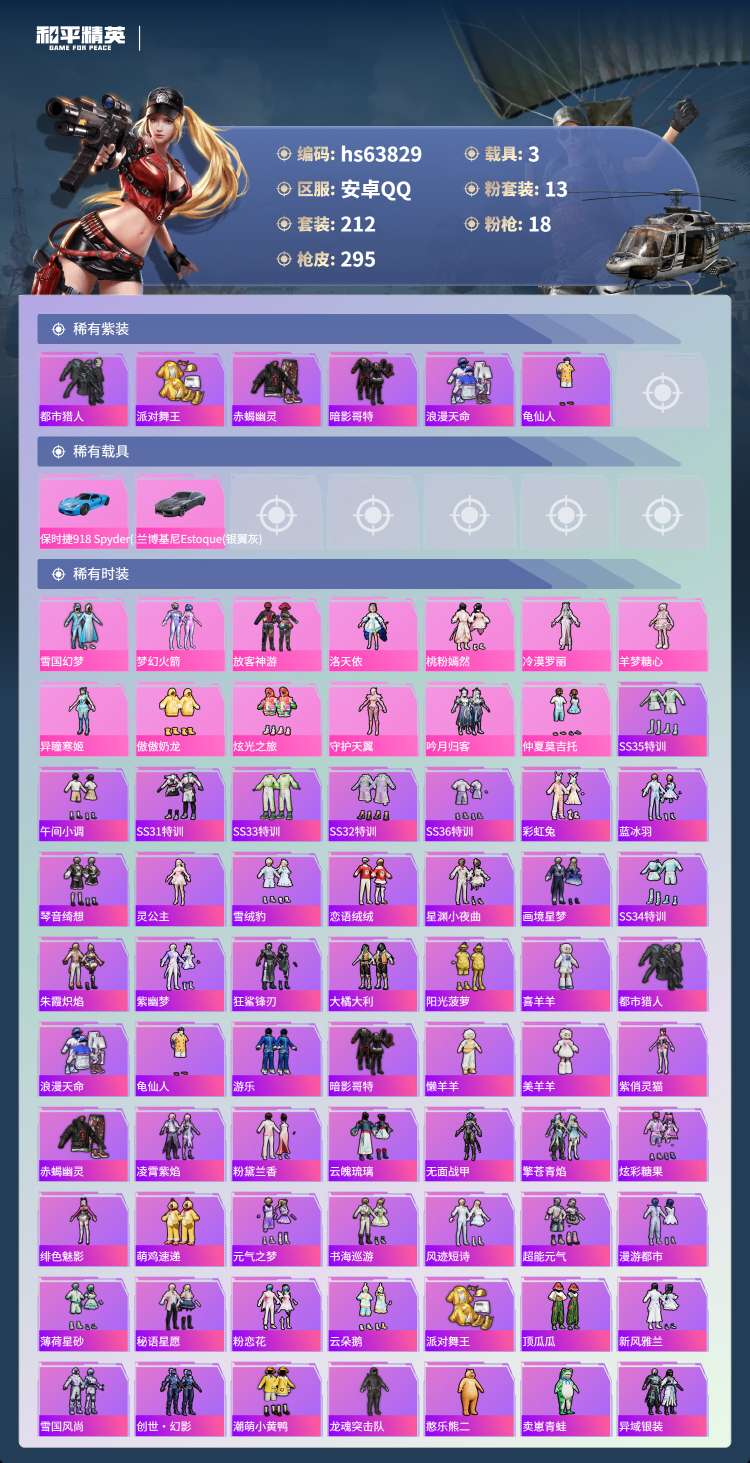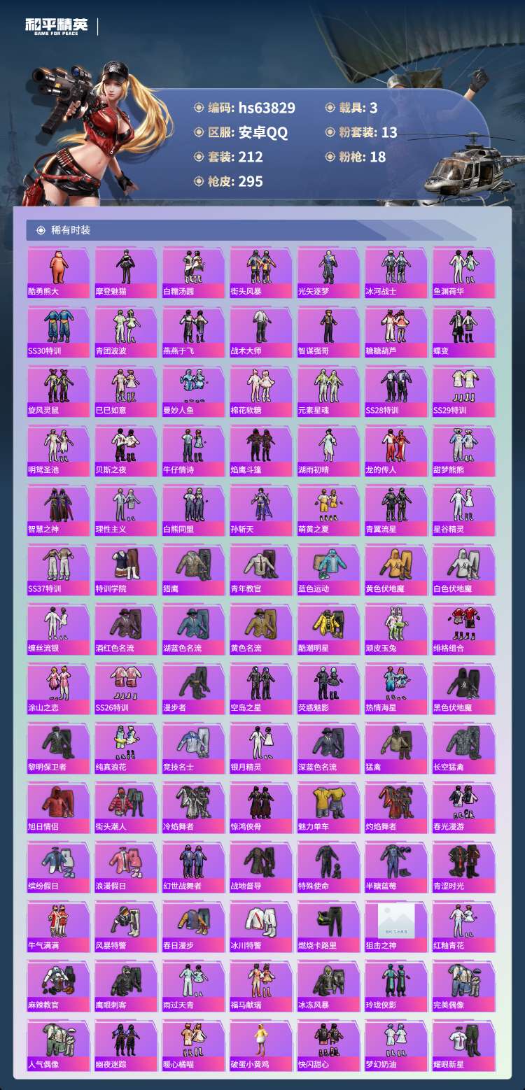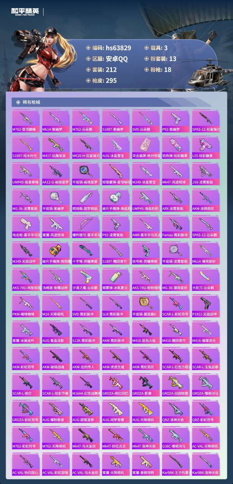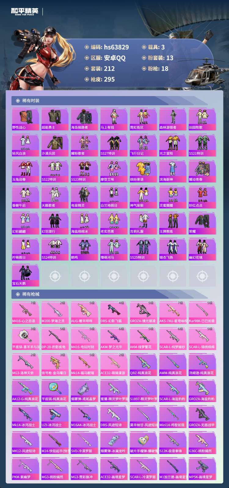 hs63829 安卓手Q-13王牌印记-13粉装-18特效枪-3载具-98478热力值-212套装-