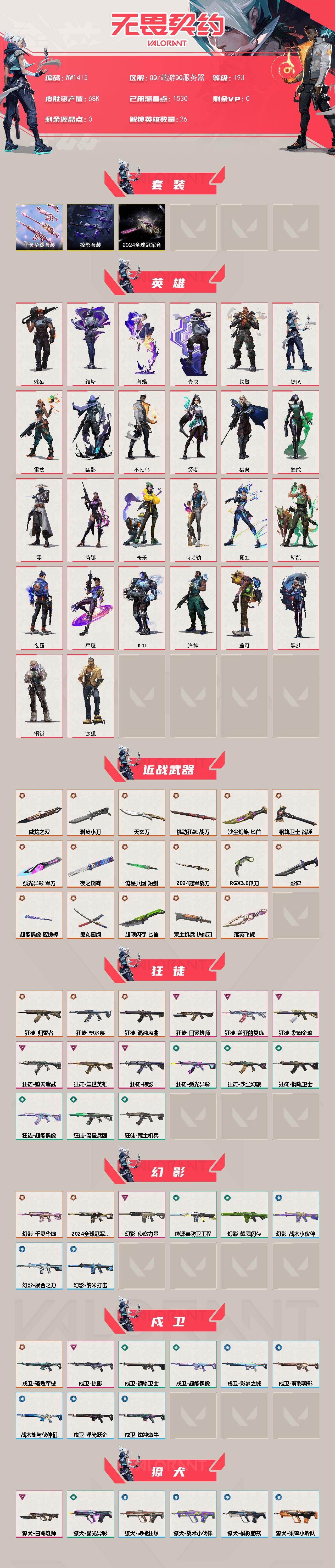 【英雄】:炼狱,维斯,暮蝶,钛狐,壹决,铁臂,捷风,雷兹,幽影,不死鸟,贤者,猎枭,蝰蛇,零,芮娜,奇乐,尚勃勒,霓虹,斯凯,夜露,星礈,K/O,海神,盖可,黑梦,钢锁