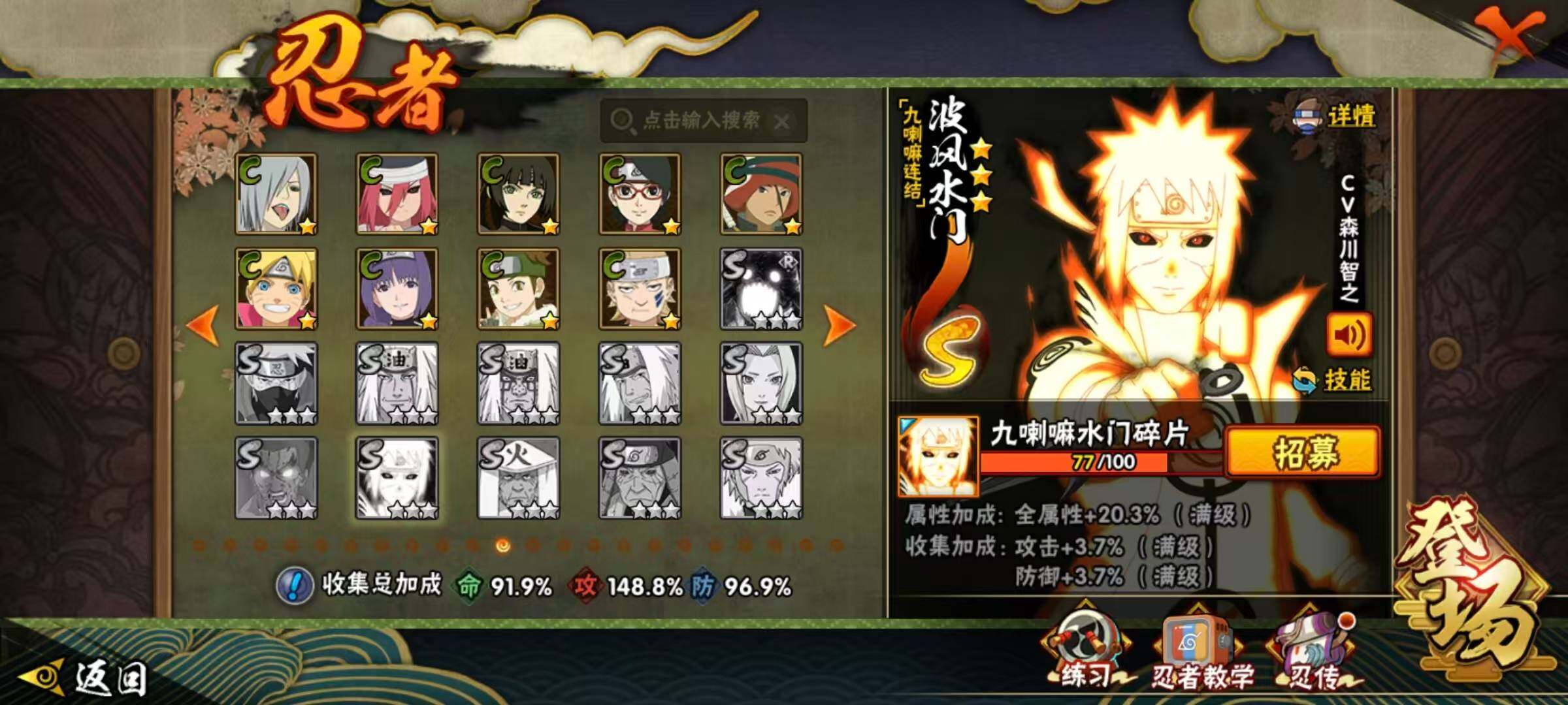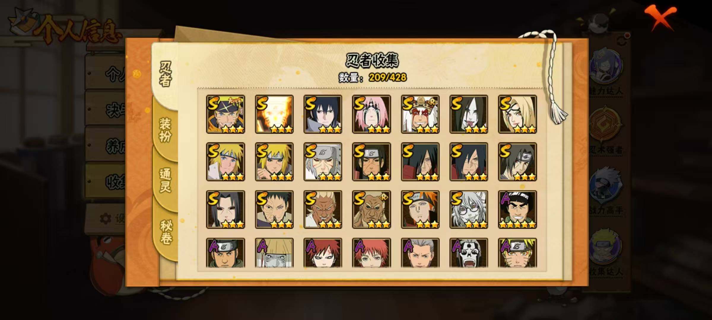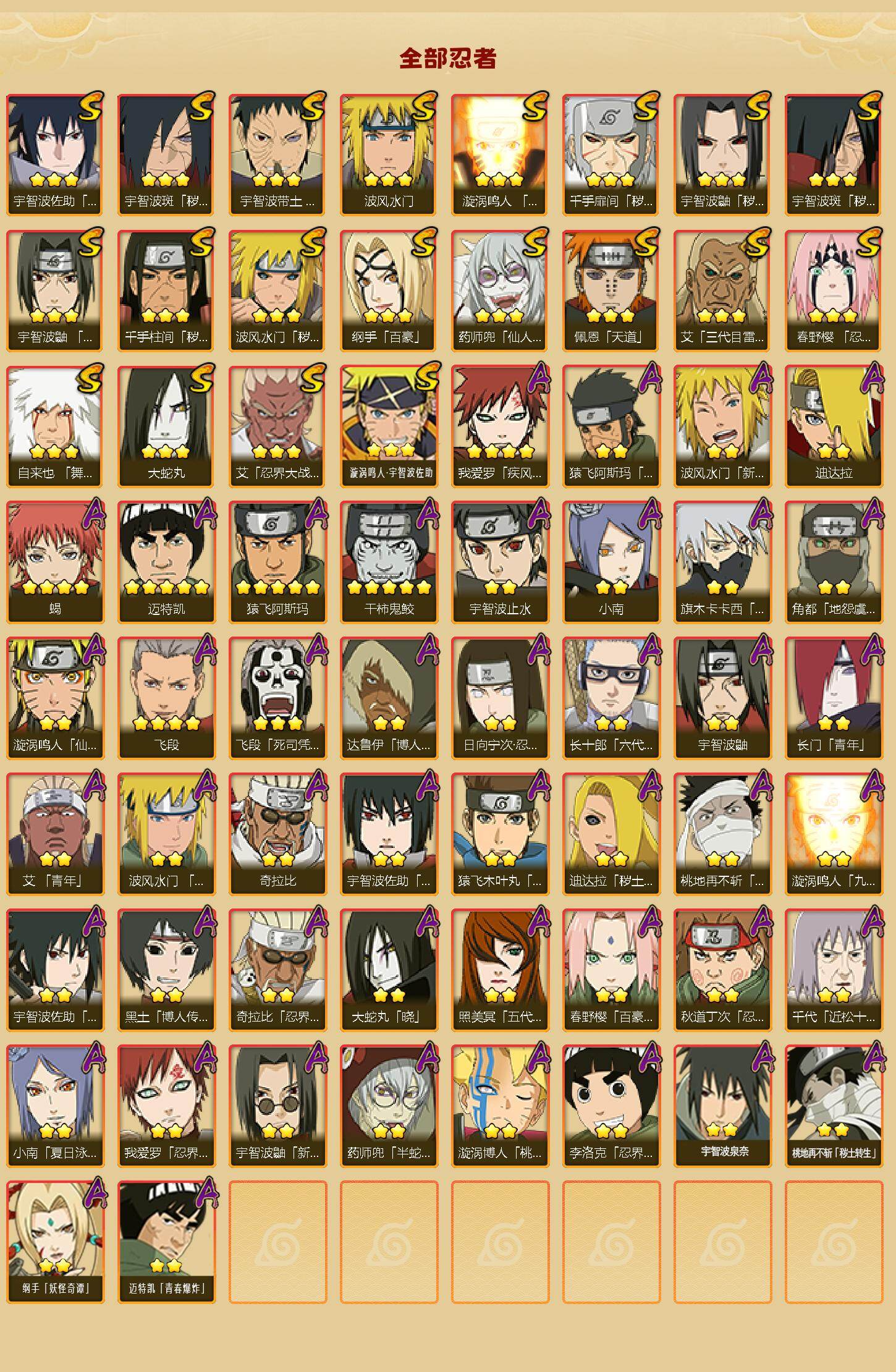 20S级忍者数-46A级忍者数【S级忍者】:波风水门「秽土转生」(3星),千手扉间「秽土转生」(3星),千手柱间「秽土转生」(3星),宇智波鼬「秽土转生」(3星),宇智波斑「秽土转生」(3星),宇智波斑「秽土转生·解」(3星),春野樱「忍界大战」(3星),宇智波带土「忍界大战」(3星),艾「忍界大战」(3星),宇智波鼬「须佐能乎」(3星),艾「三代目雷影」(3星),自来也「舞之豪杰」(3星),大蛇丸(3星),纲手「百豪」(3星),波风水门(3星),药师兜「仙人模式」(3星),漩涡鸣人「九喇嘛连结