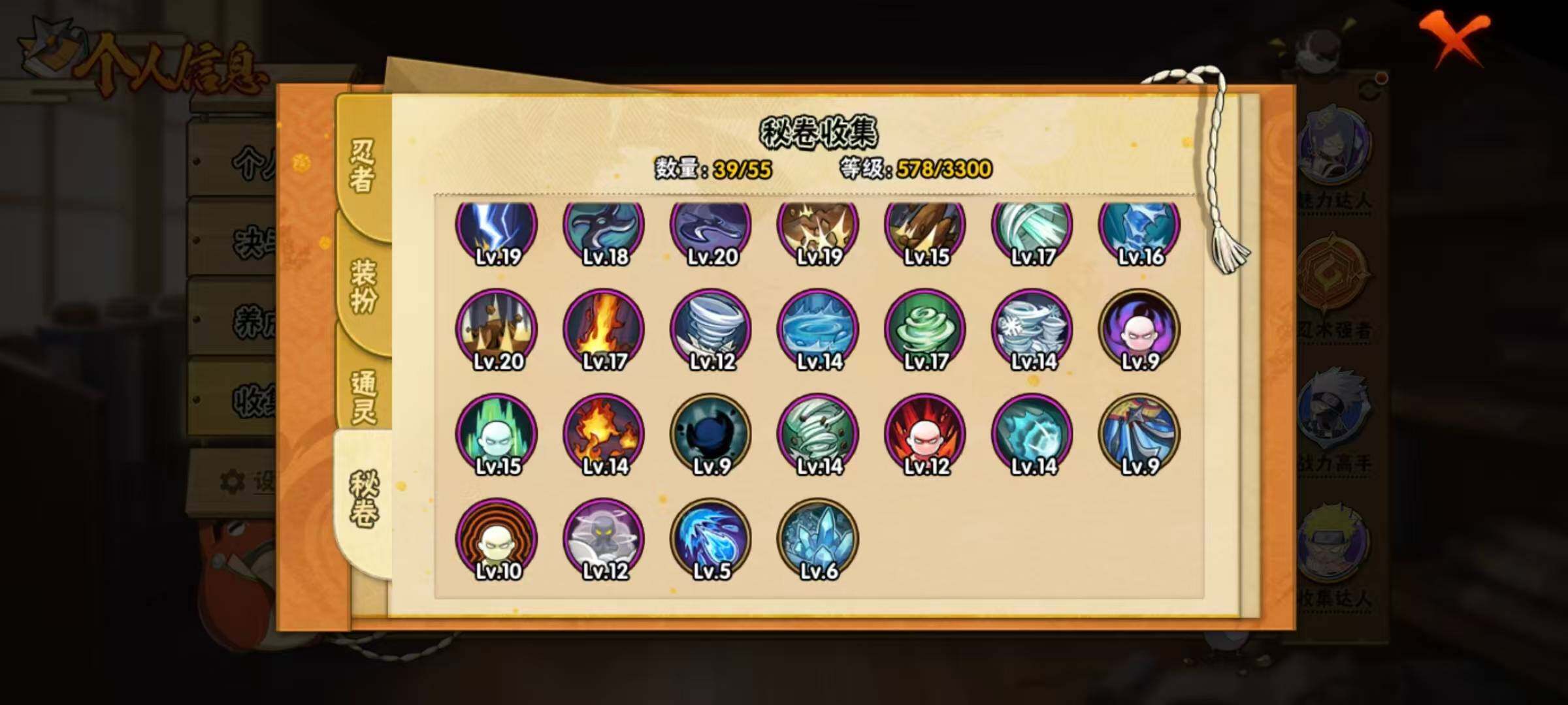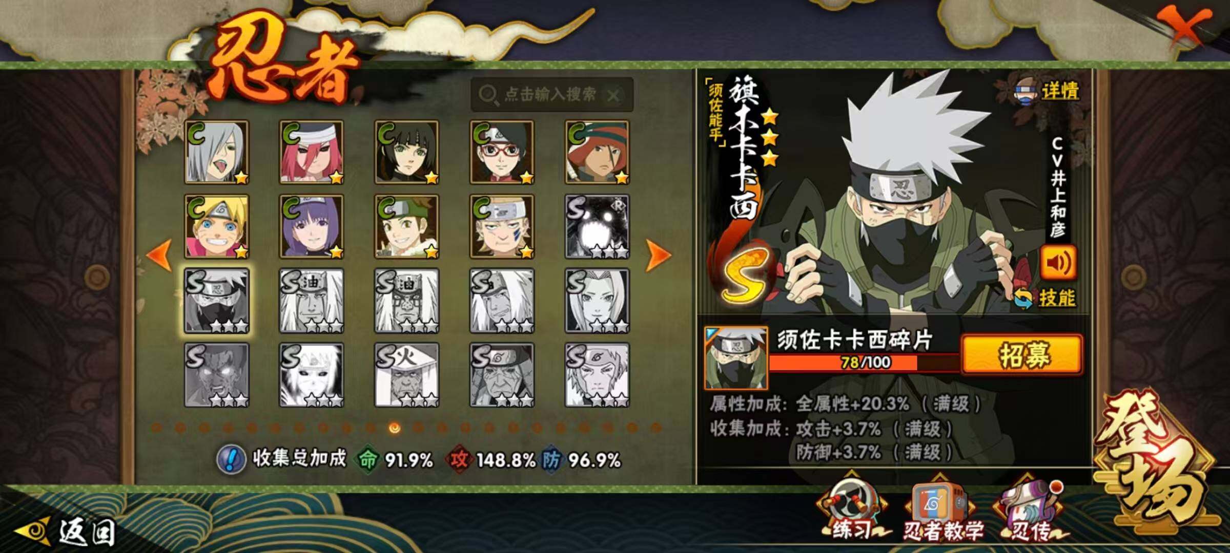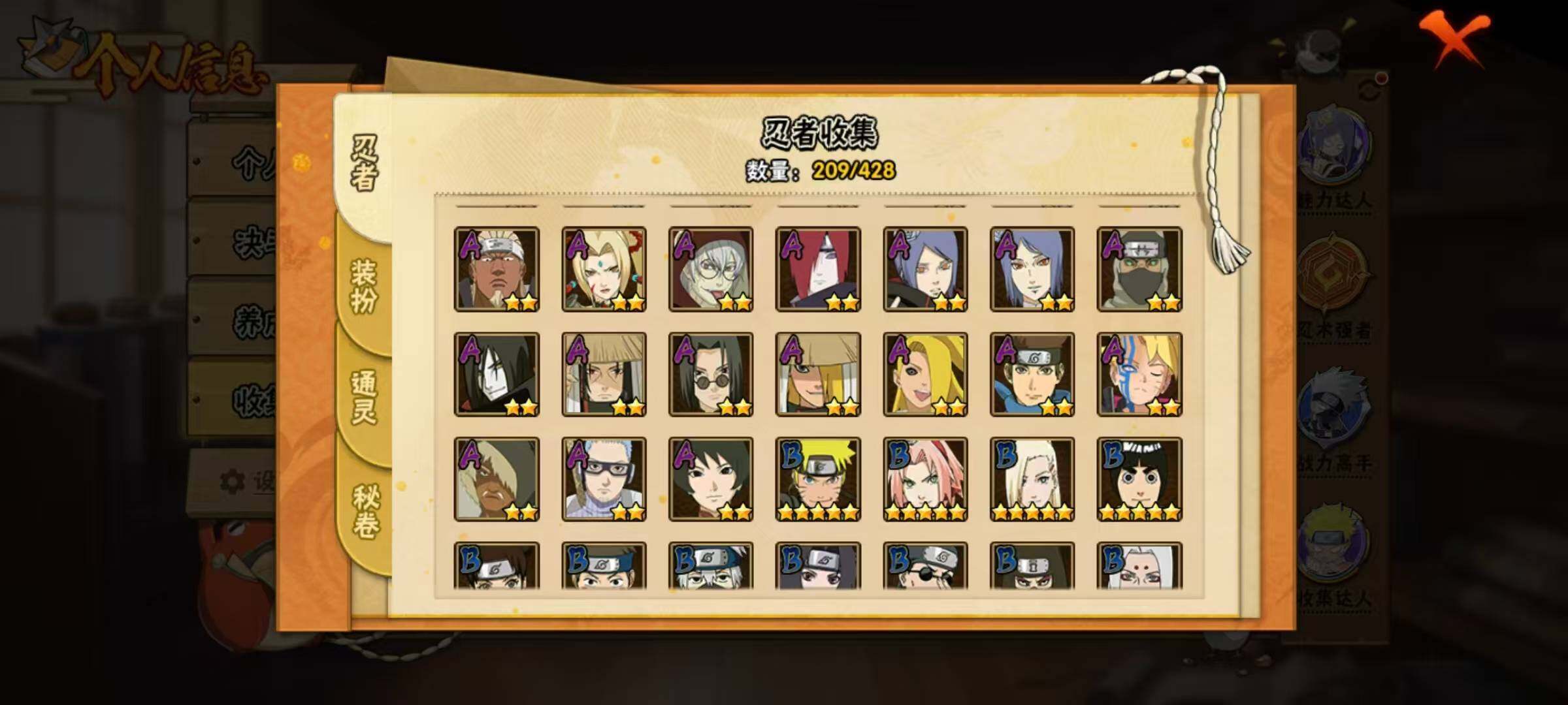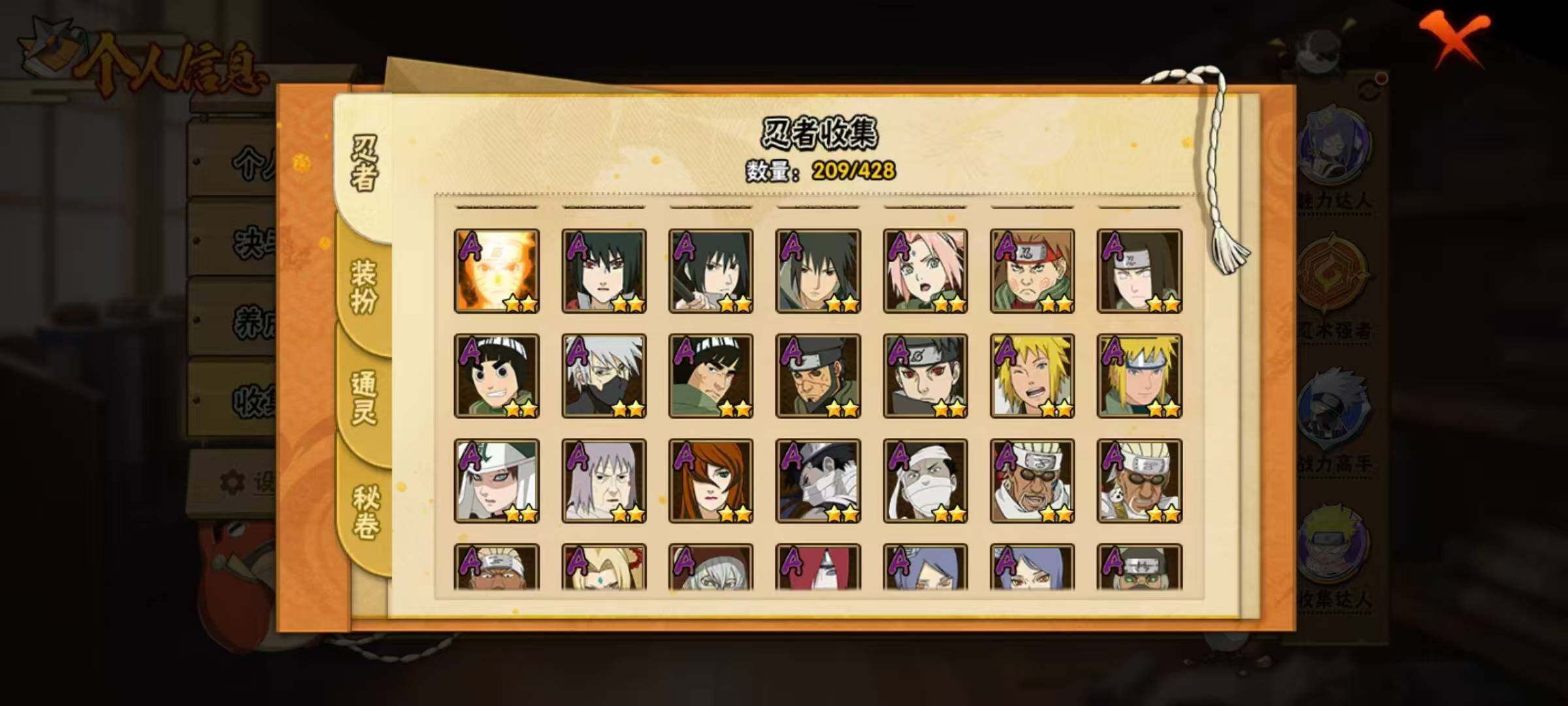 20S级忍者数-46A级忍者数【S级忍者】:波风水门「秽土转生」(3星),千手扉间「秽土转生」(3星),千手柱间「秽土转生」(3星),宇智波鼬「秽土转生」(3星),宇智波斑「秽土转生」(3星),宇智波斑「秽土转生·解」(3星),春野樱「忍界大战」(3星),宇智波带土「忍界大战」(3星),艾「忍界大战」(3星),宇智波鼬「须佐能乎」(3星),艾「三代目雷影」(3星),自来也「舞之豪杰」(3星),大蛇丸(3星),纲手「百豪」(3星),波风水门(3星),药师兜「仙人模式」(3星),漩涡鸣人「九喇嘛连结