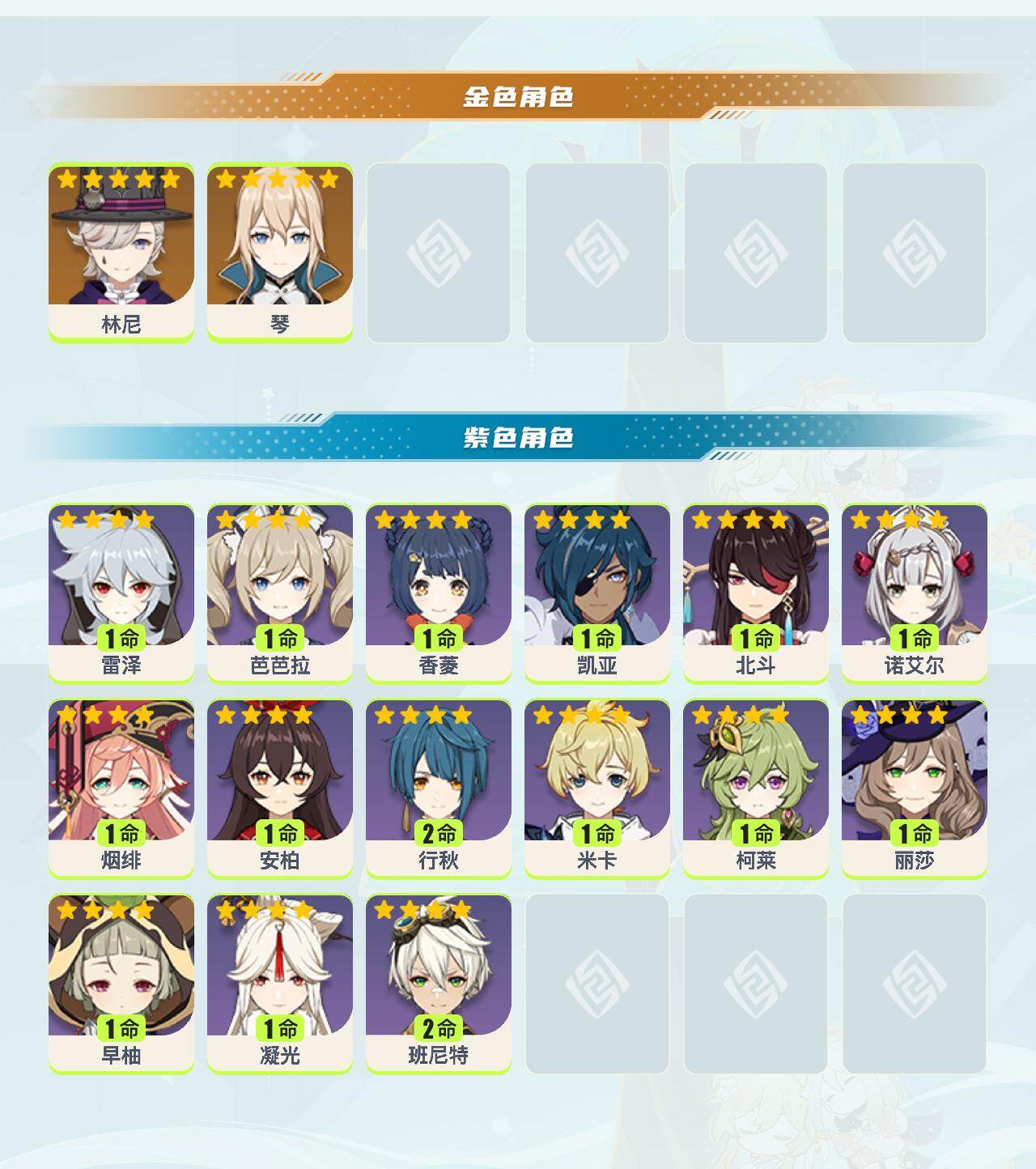 林尼(0命),琴(0命)【紫色角色】:米卡(0命),柯莱(1命)