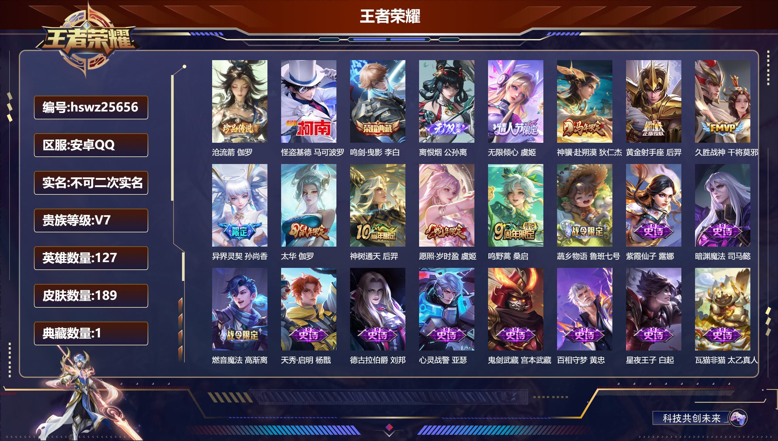 安卓QQ/最强王者/189皮肤/127英雄/1典藏/0珍品无双/1无双/2珍品传说/9传说/65史诗