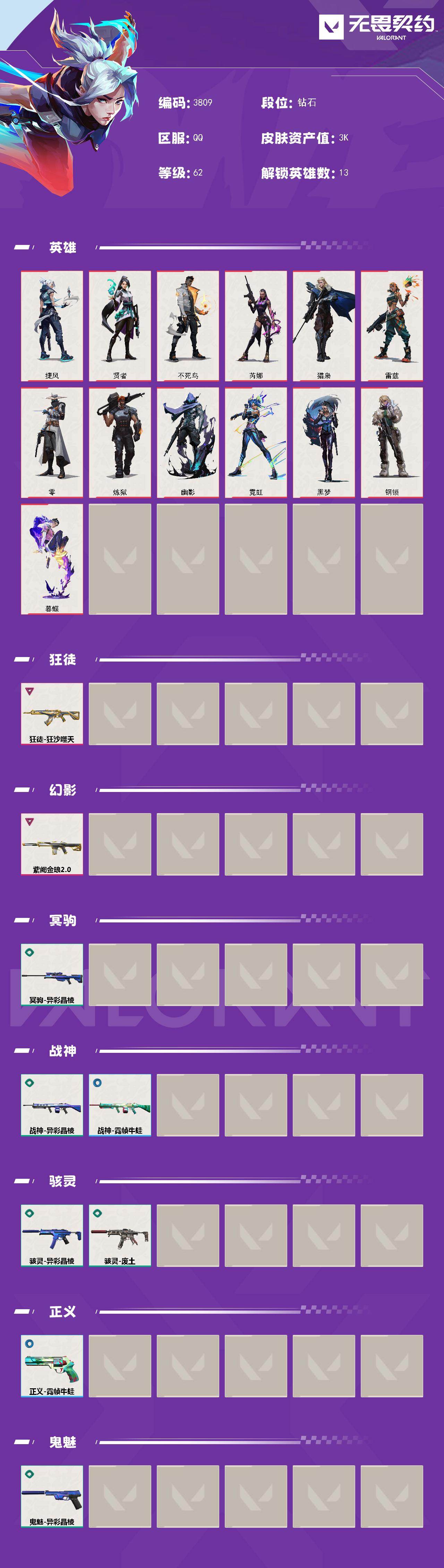 【英雄】:捷风,贤者,不死鸟,芮娜,猎枭,雷兹,零,炼狱,幽影,霓虹,黑梦,钢