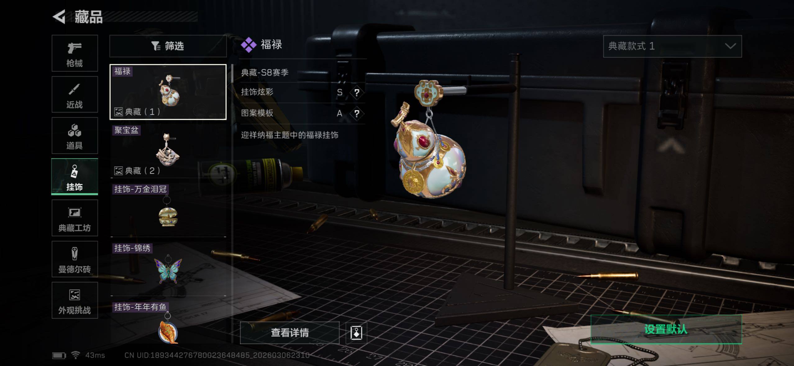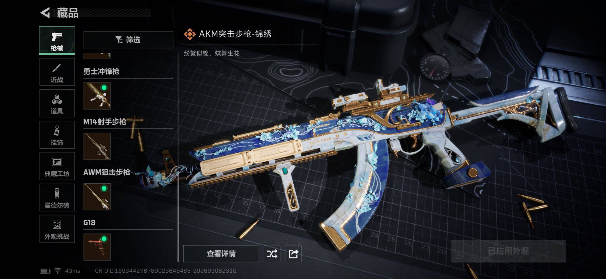 【传说外观】:AKM突击步枪-锦绣,K416突击步枪-行动记录,腾龙突击步枪-马年祥瑞,腾龙突击步枪-万金泪冠,K437突击步枪-锦绣,SMG-45冲锋枪-锦绣,SR-3M紧凑突击步枪-荼蘼,勇士冲锋枪-万金泪冠,M14射手步枪-蛮荒,AWM狙击步枪-万金泪冠,G