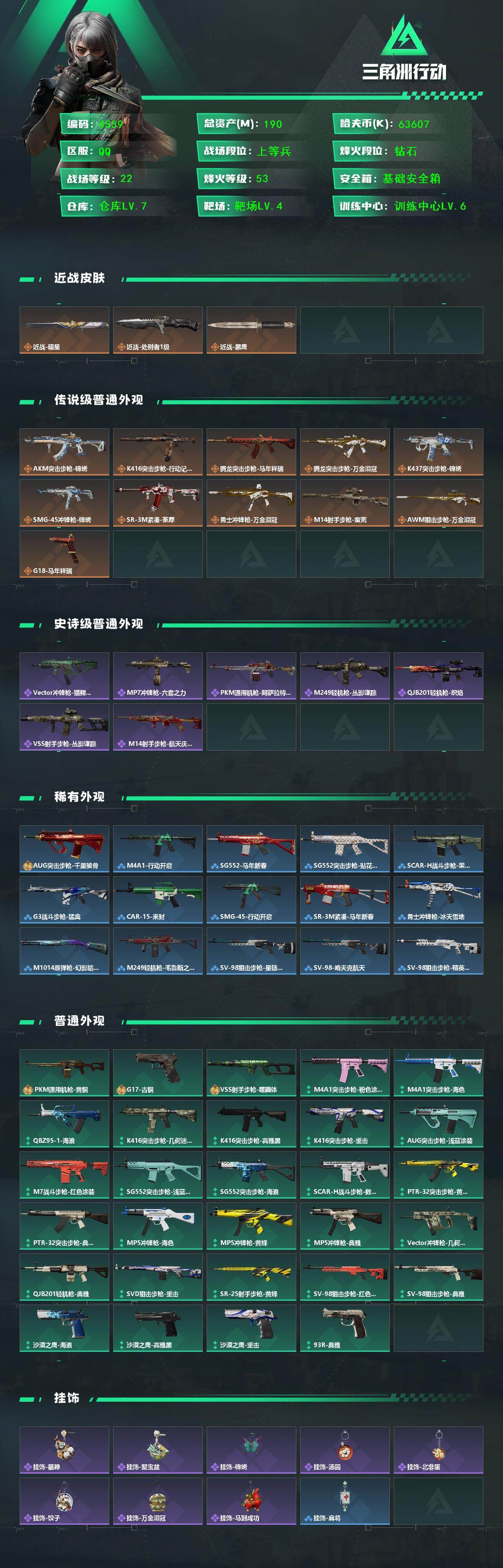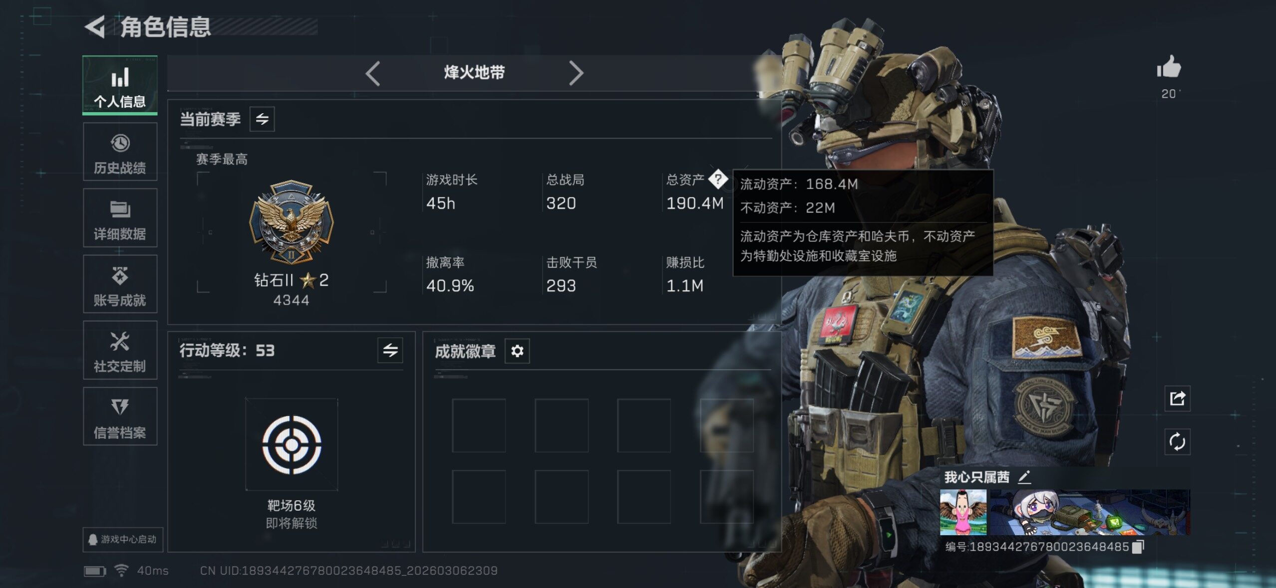 190m总资产-63607k哈伏币-53烽火等级-钻石-22战场等级-上等兵