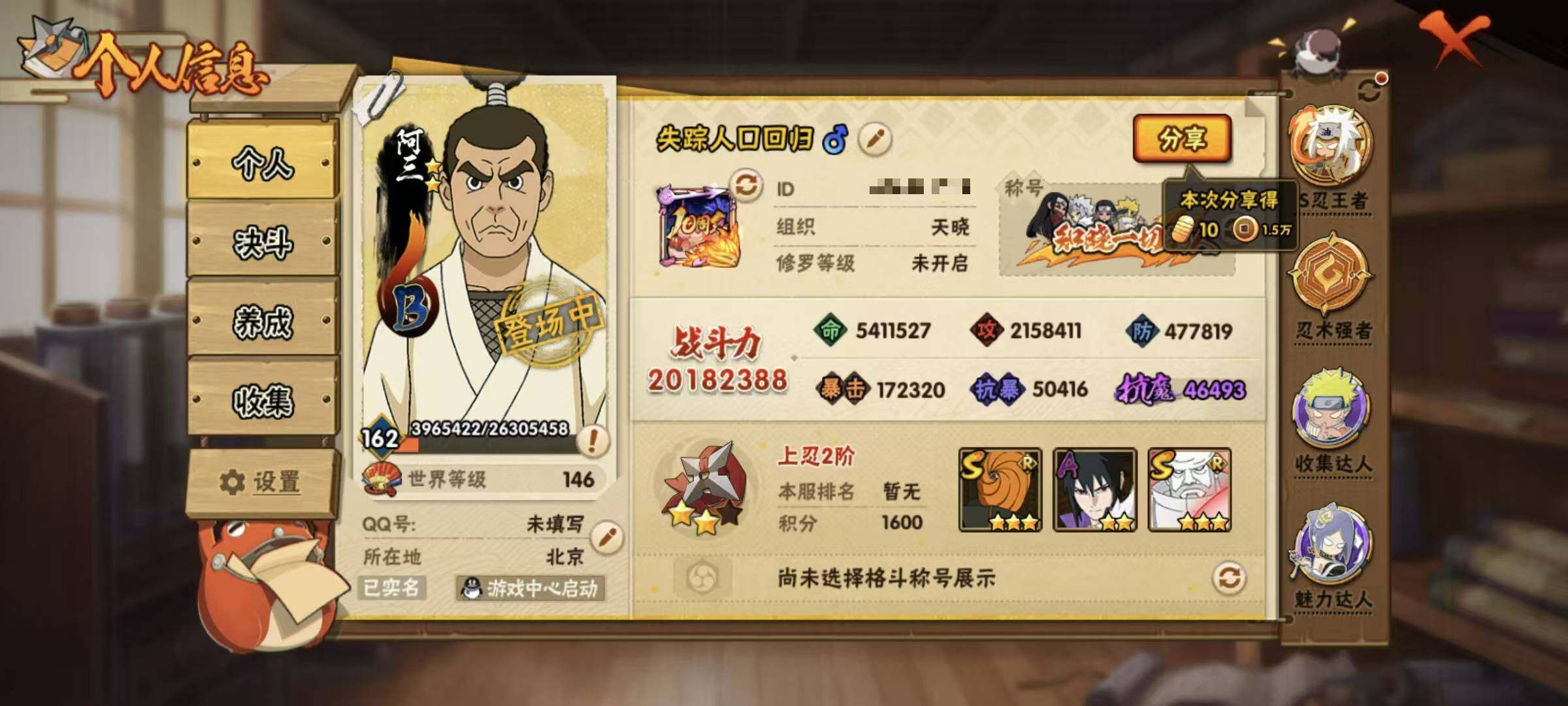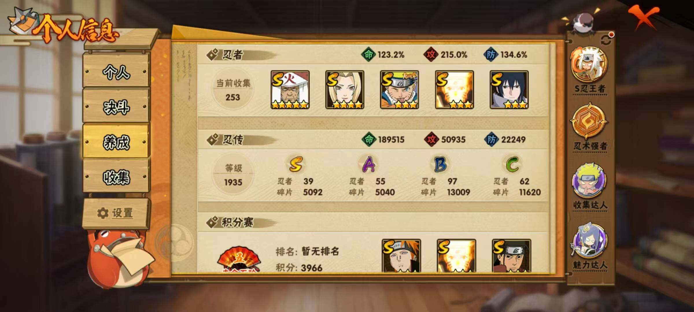 39S级忍者数-55A级忍者数仙人自来也89片 烈斗98片 大野木66片 1.9w金币连体王者2典藏8传说261皮肤,和平带多粉装1载具,附带金铲铲