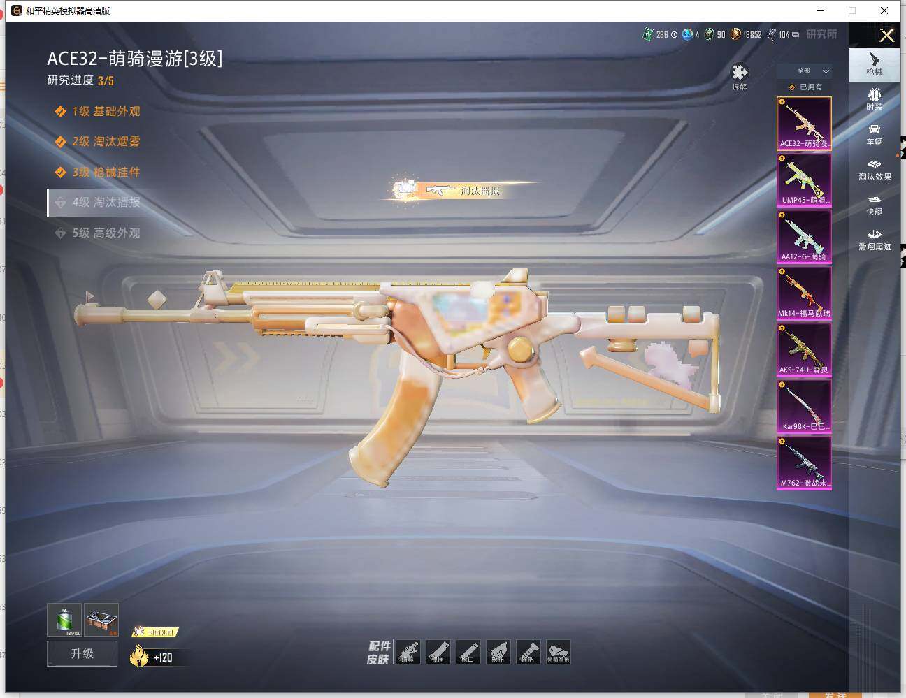 【粉色枪皮等级】:M762-激战未来(七级),ACE32-萌骑漫游(三级),UMP45-萌骑冒险(三级),AKS-74U-森灵之息(五级),Kar98K-巳巳如意(五级),Mk14-福马献瑞(五级),AA12-G-萌骑幻想(二级)