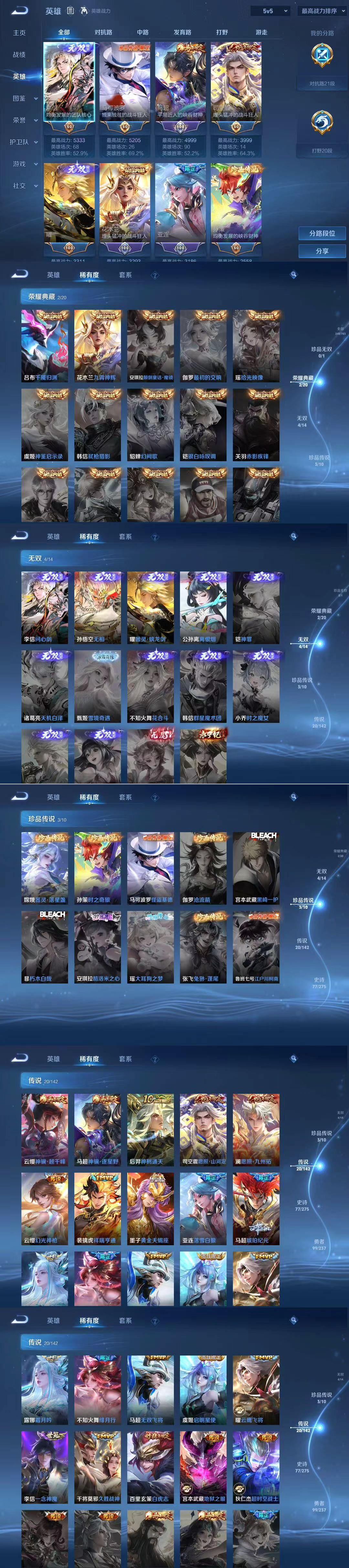 V8 2典藏 4无双 3珍品 20传说 2星元 时之思念 幽冥之眼 荣耀王者对抗路21段 打野20段