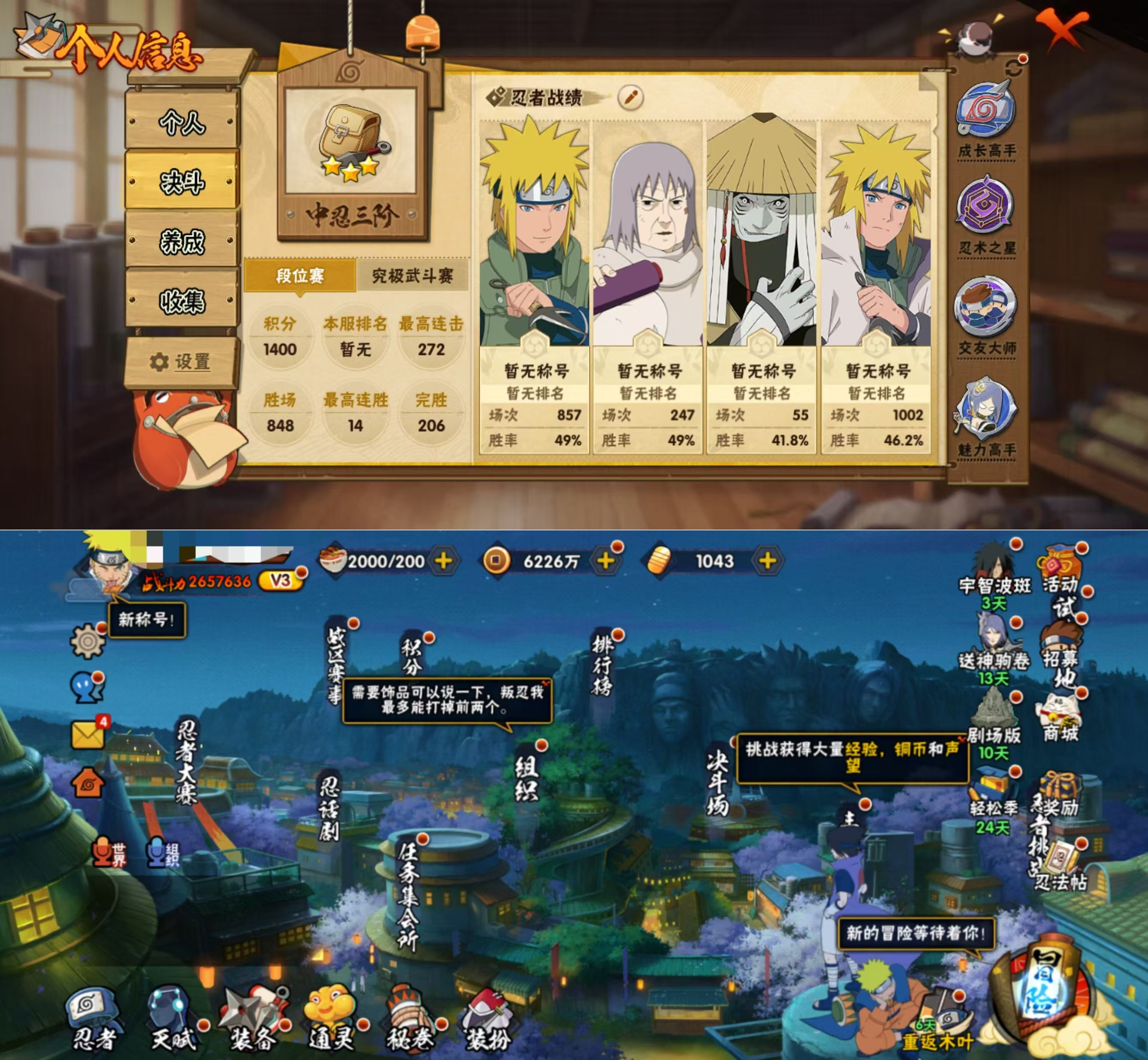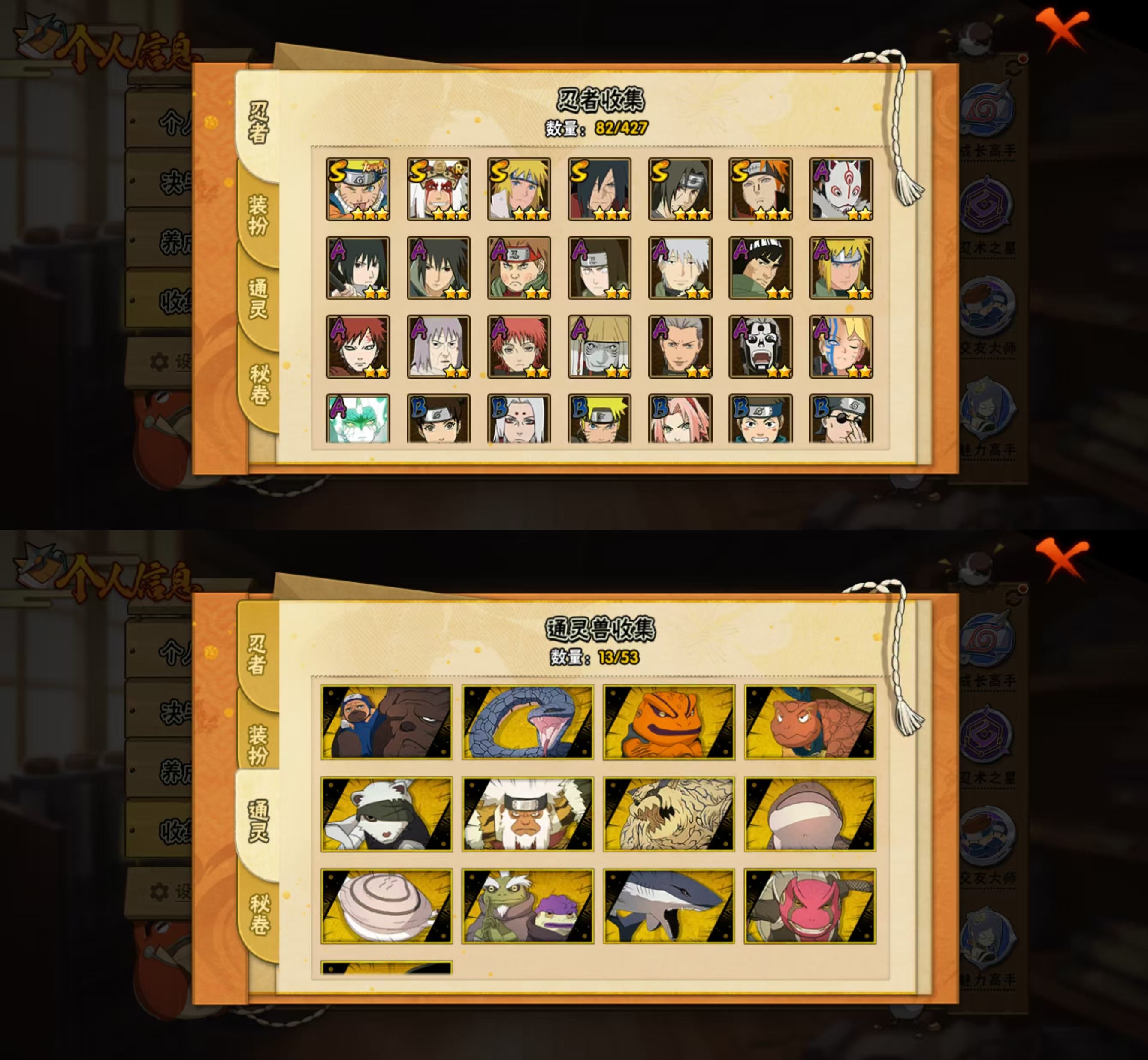 DHY747有二次【区服】2175【等级】142【S级数量】6【A级数量】16【B级数量】30【C级数量】30【S级】漩涡鸣人·宇智波佐助 自来也「舞之豪杰」 宇智波鼬「须佐能乎」 波风水门 宇智波斑「秽土转生·解」 佩恩「天道」【A级】千代「近松十人卫」 神秘面具男「忍者之路」 巳月「仙人模式」 宇智波泉奈 飞段「死司凭血」 宇智波佐助「须佐能乎」 漩涡博人「桃式显现」 蝎 干柿鬼鲛 波风水门「青年」 旗木卡卡西「幻之真容」 我爱罗「疾风传」 日向宁次「忍界大战」 飞段 迈特凯「青春爆炸」 秋