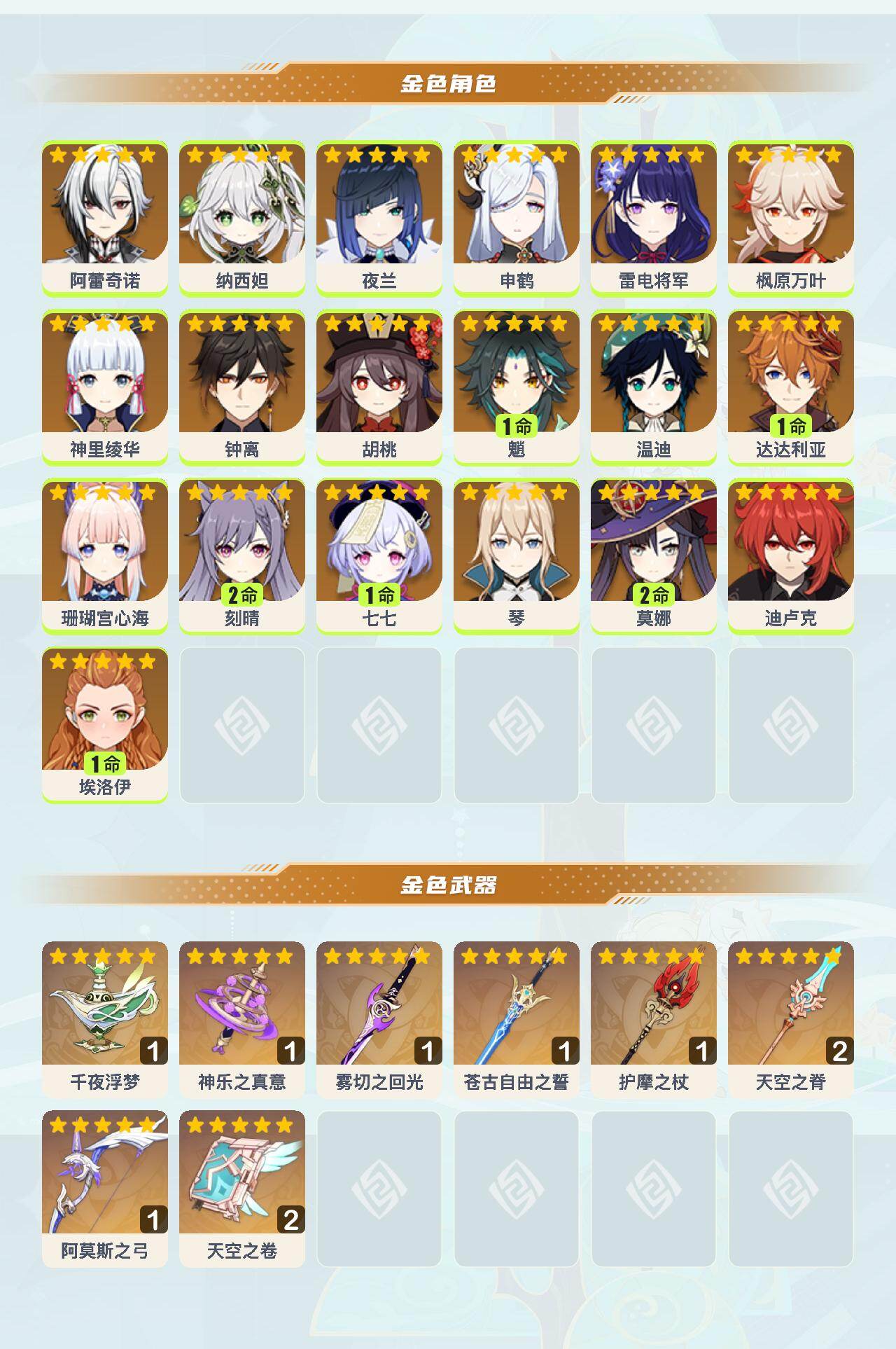 【YSA1068】60级/36黄/女主/19个五星角色/8个五星武器/纳西妲/雷电将军/珊瑚宫心海/枫原万叶/1命魈/神里绫华/1命达达利亚/胡桃/钟离/温迪/申鹤/2命刻晴/夜兰/2命莫娜/琴/1命七七/迪卢克/0命埃洛伊/阿蕾奇诺/阿莫斯之弓/千夜浮梦/神乐之真意/精2天空之卷/精2天空之脊/护摩之杖/雾切之回光/苍古自由之誓
