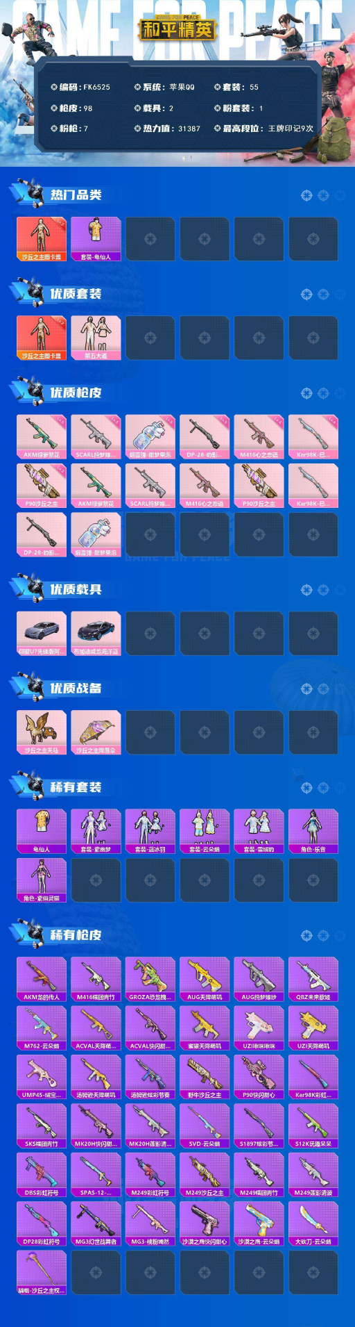 丘之主-图卡盟-2载具-1神装1粉装7特效枪-游戏等级54-极品身法素材号】Q等级32-苹果手Q-1神装-1粉装-7特效枪-2载具-1粉色飞行器-31387热力值-9王牌印记-55套装-98枪皮(送安卓Q-1载具-阿斯顿马丁蓝) 【红色神装等级】:沙丘之主-图卡盟(二级) 【红色角色神装】:沙丘之主-图卡盟 【热门品类】:套装-龟仙人 【粉色套装】:粉装-第五大道 【粉色枪皮等