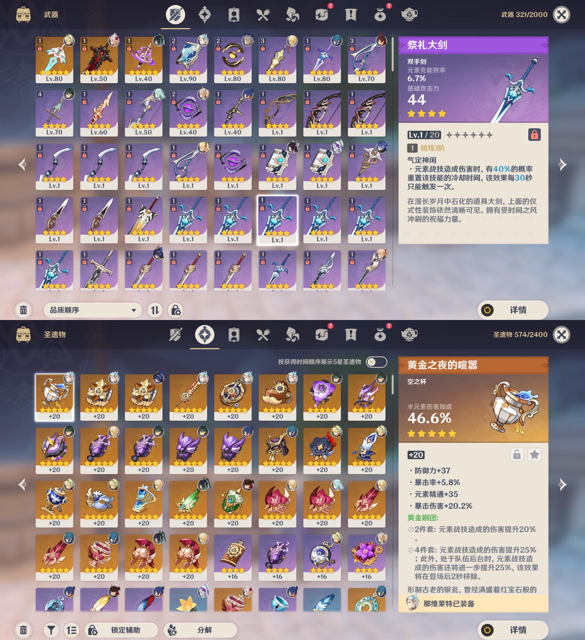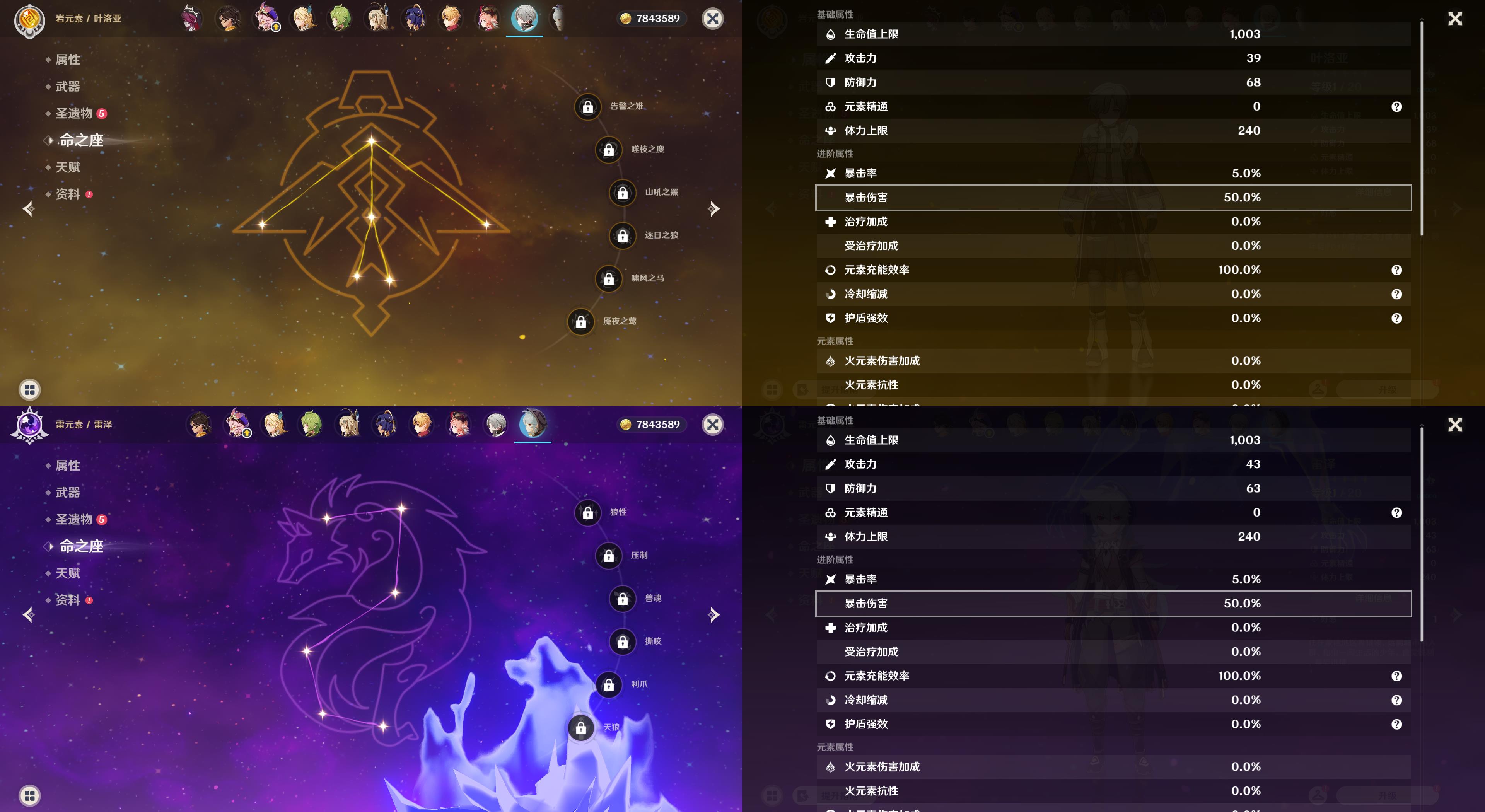 55级/11黄/女主/8个五星角色/3个五星武器0命克洛琳德,0命闲云,0命那维莱