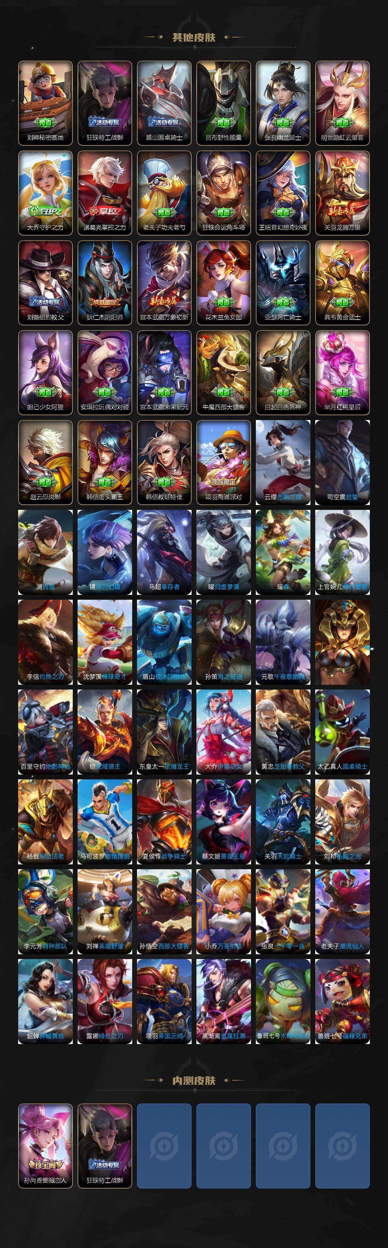 【限定皮肤】:蒙犽顽岩魄,大乔绒语心约,虞姬夏日便利店,姜子牙天穹之誓,杨戬破阵退雄兵,狄仁杰阴阳师,赵云皇家上将,孙尚香蔷薇恋人,元歌无心,典韦蓝屏警告,狄仁杰魔术师,项羽海滩派对,孙悟空孙行者,