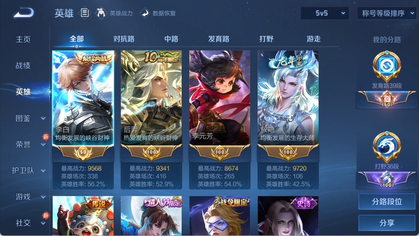 贵族等级: V10 英雄数: 127 皮肤数: 445