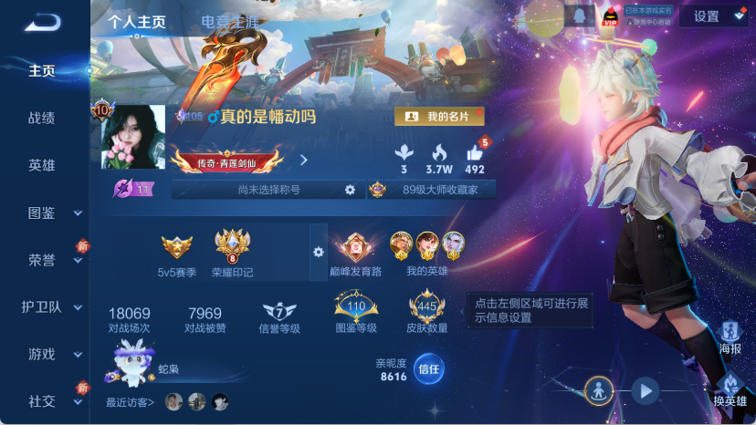 实名: 可修改 贵族等级: V10 英雄数: 127 皮肤数: 445 荣耀水晶: 鸣剑·曳影,全息碎影,星域神启,最初的交响 珍品传说: 朽木白哉 传说皮: 黄金狮子座,黄金射手座,云鹰飞将,黄金白羊座,炽阳神光,一念神魔,云霓雀翎,末日机甲-孙尚香,地狱火,仲夏夜之梦,零号·赤焰,地狱之眼,音你心动-周瑜,胖达荣荣,李逍遥,时之恋人-刘备,淬星耀世,超时空战士-狄仁杰,末日机甲-孙策,无双飞将,碎云,澜逐花归海,艾琳觅芳踪,乘龙·问璇玑,幻光神枪,神树通天 限定皮: 冰锋战神,遇见飞天,李小