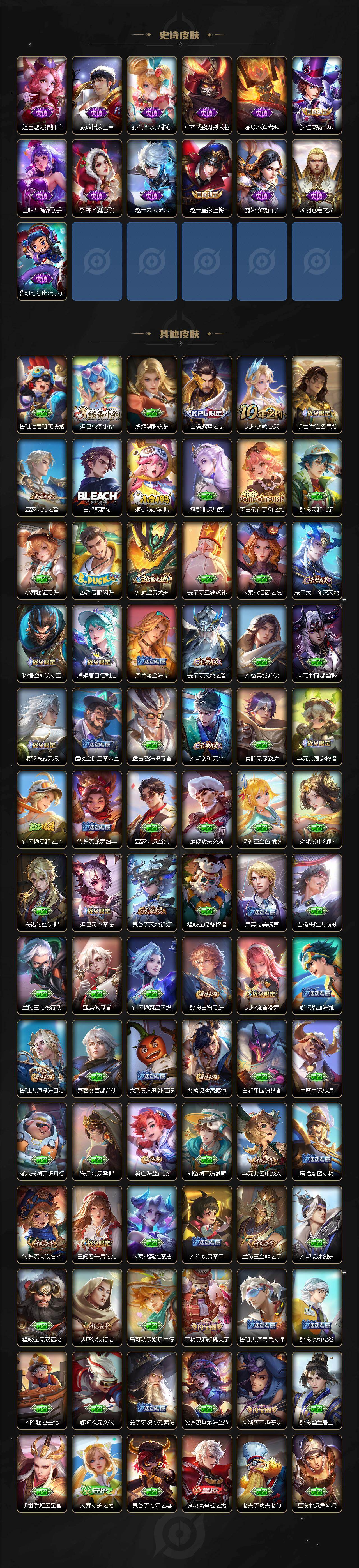 【传说皮肤】:公孙离云诺千山,嬴政玄雷天君,桑启鸣野蒿,宫本武藏惊梅引,王昭君乞巧织情,镜炽阳神光,虞姬启明星使,曜云鹰飞将,李信一念神魔,刘备时之恋人,干将莫邪久胜战神,达摩黄金狮子座,后羿黄金射手座,孙尚香末日机甲
