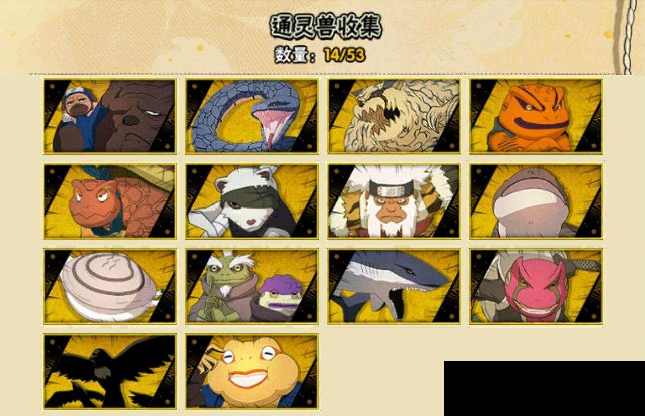 【永久通灵兽】忍犬,蓝蛇,砂之守鹤,蛤蟆吉,忍龟,镰鼬,猿魔,山椒鱼,蜃,蛤蟆仙人,鲛鲨,蛤蟆健,乌鸦,蛤蟆龙