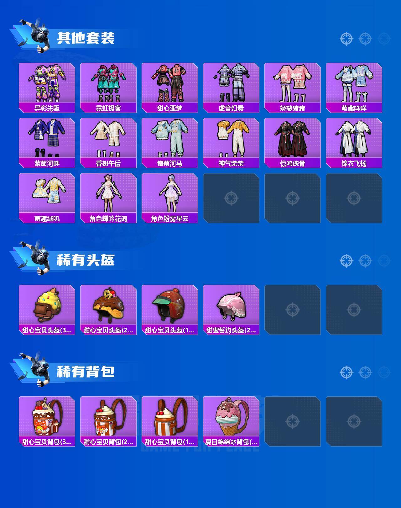 【粉色套装】:粉装-宝贝奶油派,粉装-天使彩虹糖,粉装-蝶舞迷情,粉装-冰川幽秘,粉装-第五大道,粉装-莲影清波,角色-千金淑猫,角色-樱桃泡泡,角色-幻海仙踪,角色-罪夜之冕,粉装-光之祷告,角色-月中灵,人物-小舞·恋语