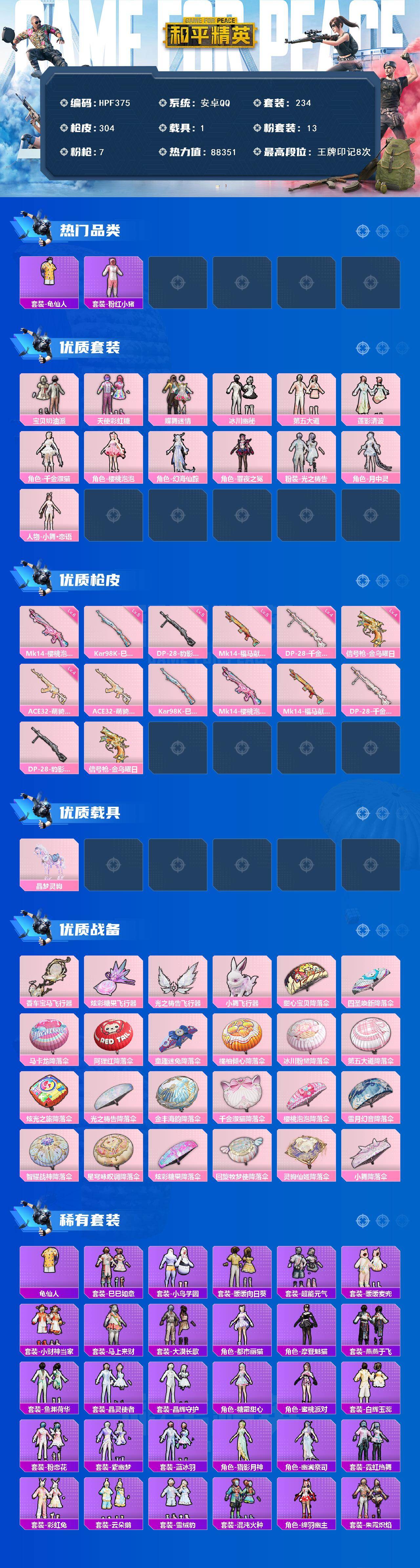 安卓 手Q-13粉装-7特效枪-1载具-5粉色飞行器-88351热力值-8王牌印记-234套装-304枪皮