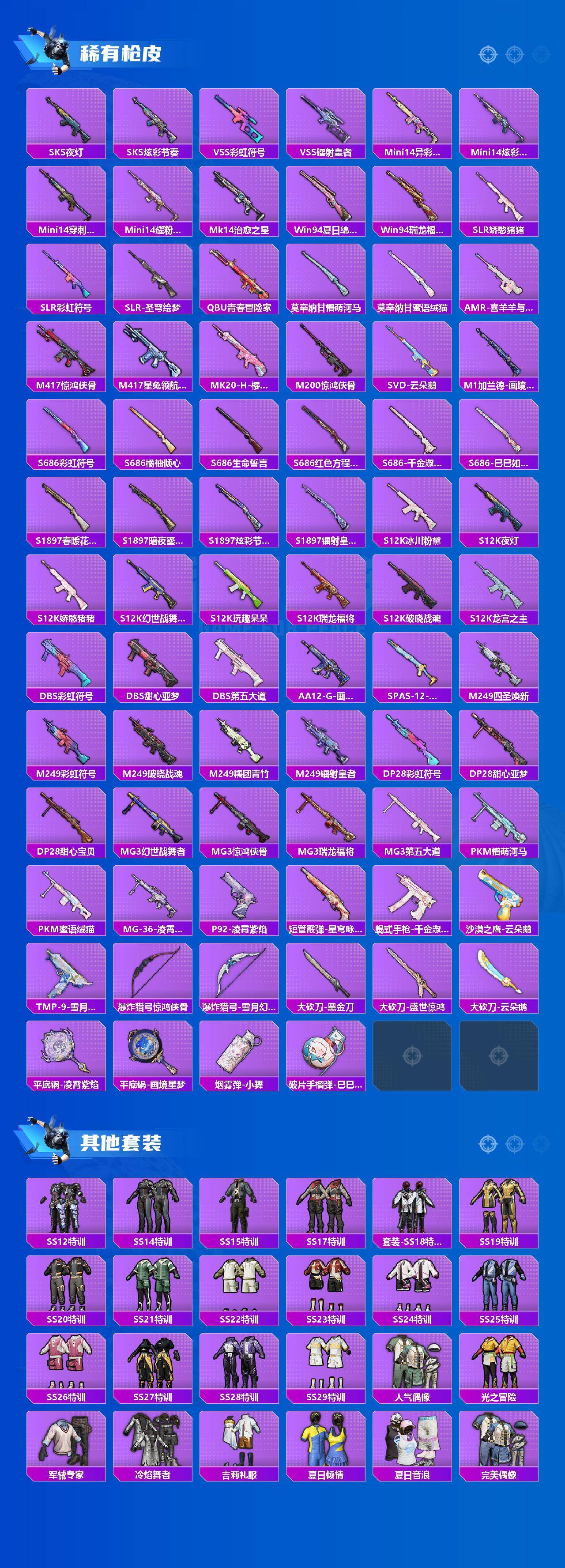 【粉色枪皮等级】:ACE32-萌骑漫游(四级),Kar98K-巳巳如意(五级),Mk14-樱桃泡泡(六级),Mk14-福马