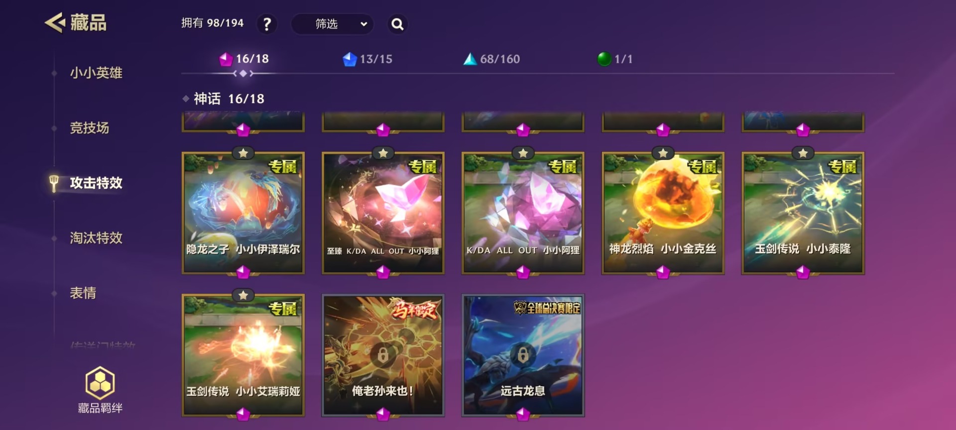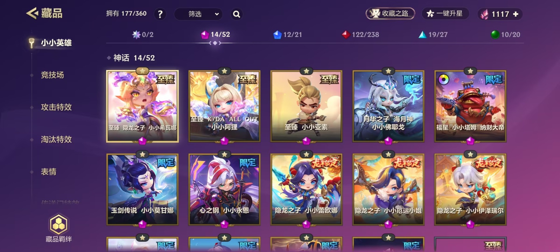 【小小英雄(神话)】福星 小小塔姆 纳财大帝,至臻 小小亚索,月华之子 海月神 小小佛耶戈,玉剑传说 小小泰隆,玉剑传说 小小艾瑞莉娅,神龙烈焰 小小金克丝,玉剑传说 小小莫甘娜,K/DA ALL OUT 小小阿狸,心之钢 小小永恩,至臻 K/DA ALL OUT 小小阿狸,至臻 隐龙之子 小小希瓦娜,隐龙之子 小小蕾欧娜,隐