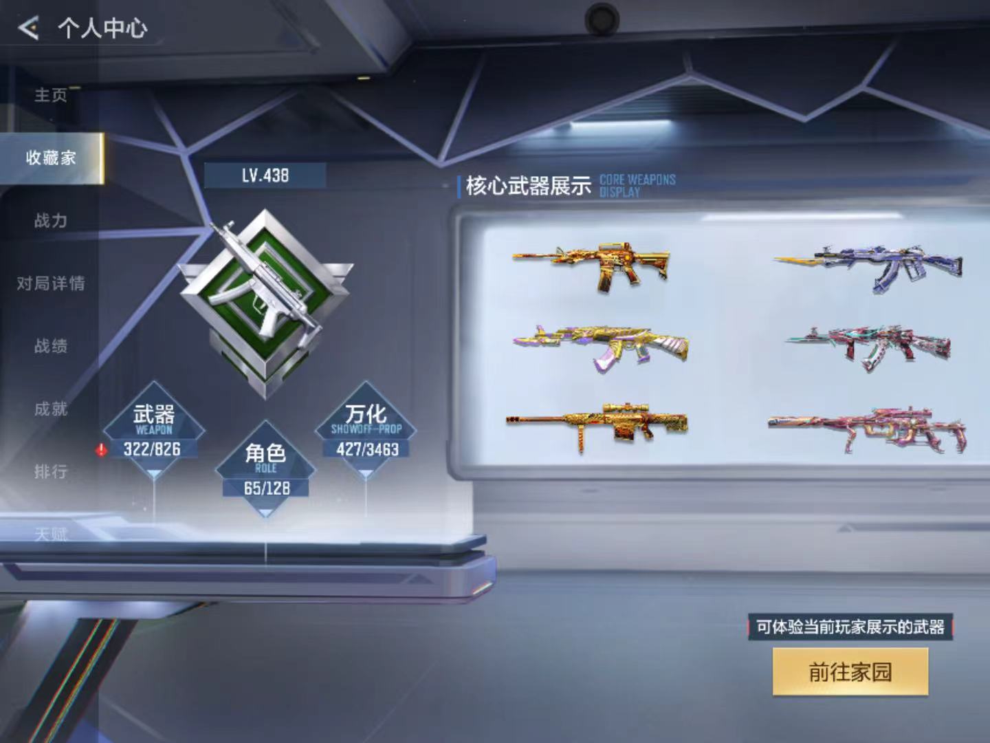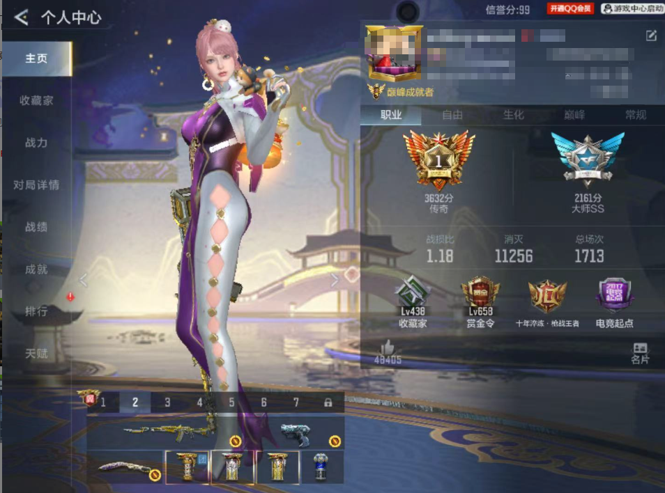 段位:大师SS,VIP等级:V9,V武器数量:433,V角色数量:14,V总数量:322,王者武器数:28,万化数量:427,音效皮肤数:6