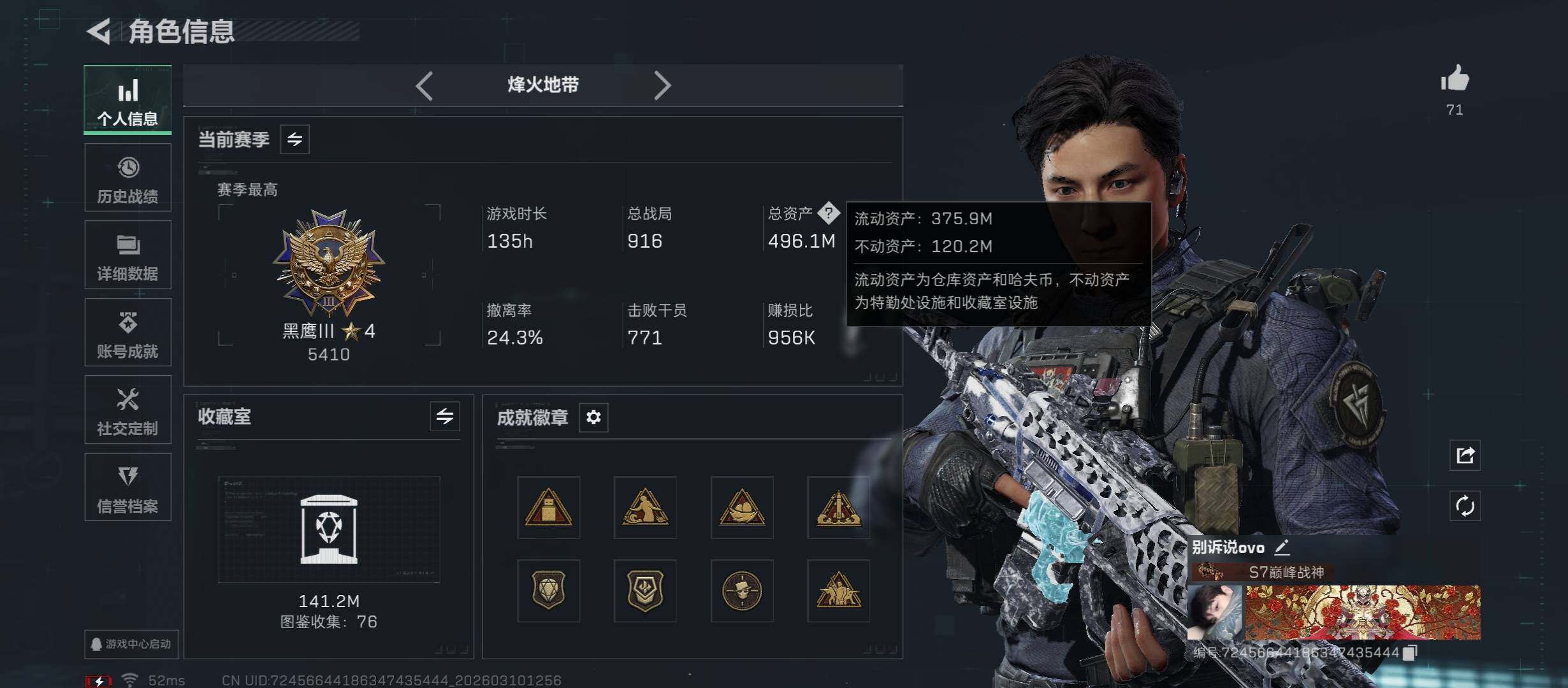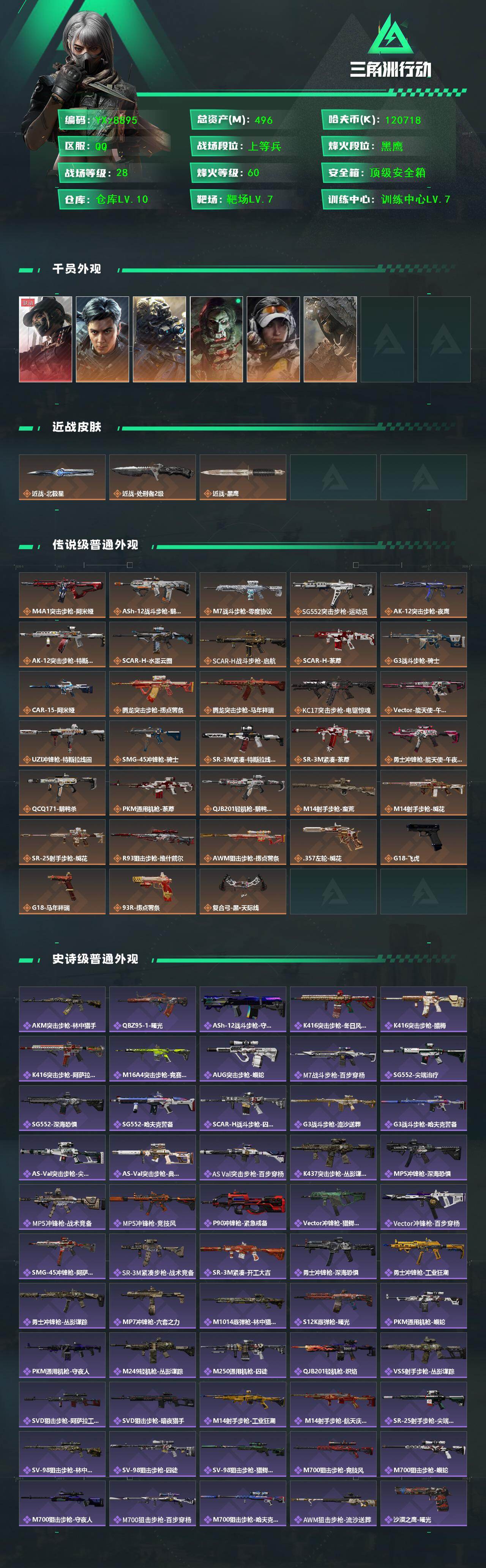 【多热门皮肤组合搭配-高额资产496M,单红+双刀+,黑天际线+飞虎+北极星+处刑者,纯现金120M,满特勤】【【无二次协助处理】】-特勤处:仓库10级/靶场7级/训练中心7级-总资产496m-哈伏币120m-60烽火等级-黑鹰-28战场等级-上等兵