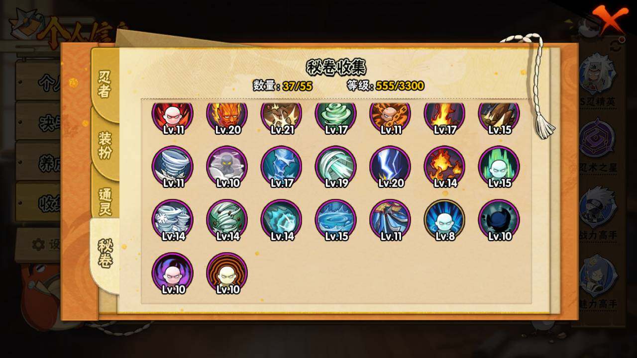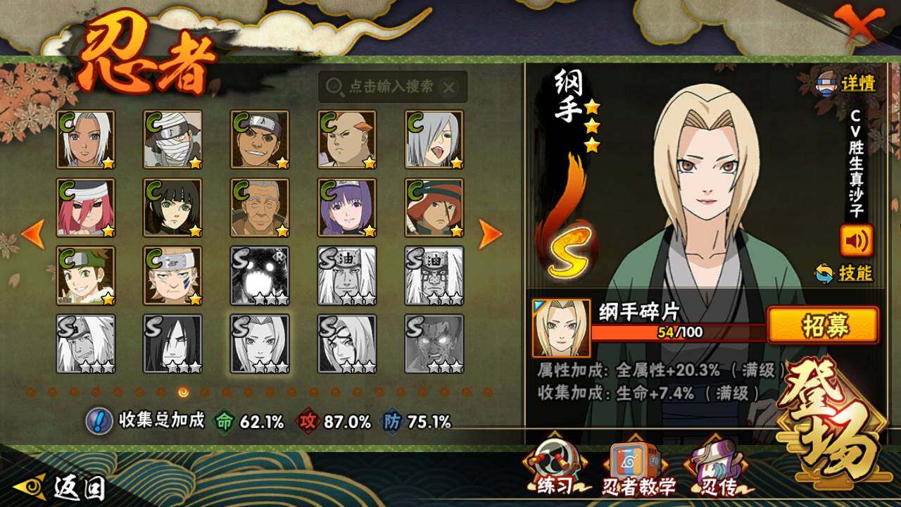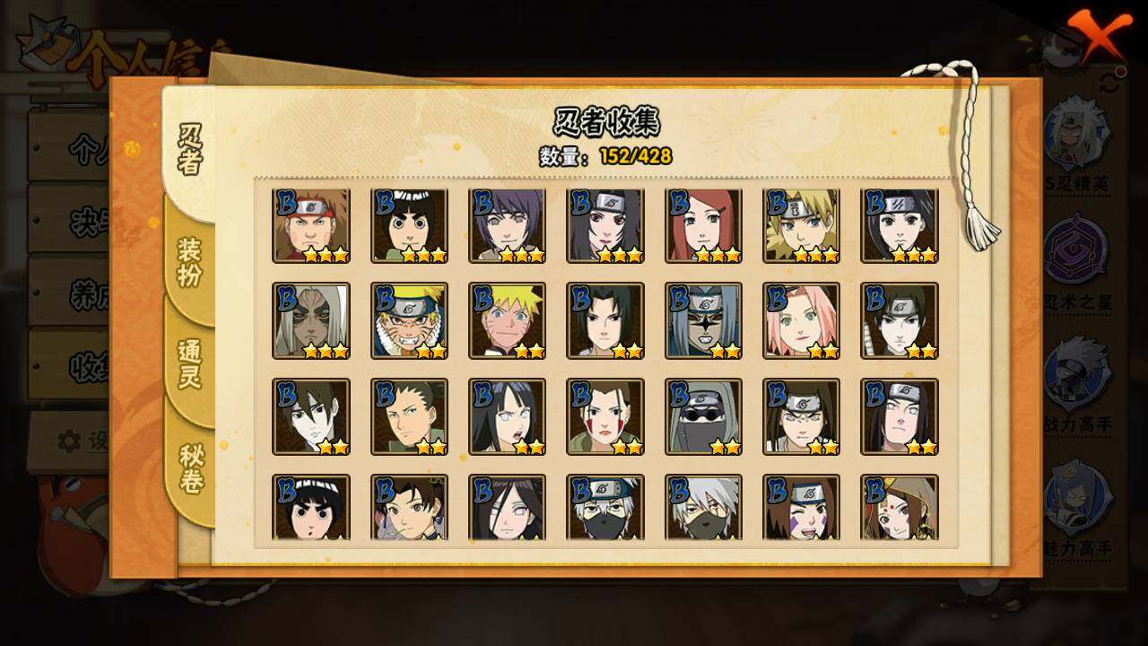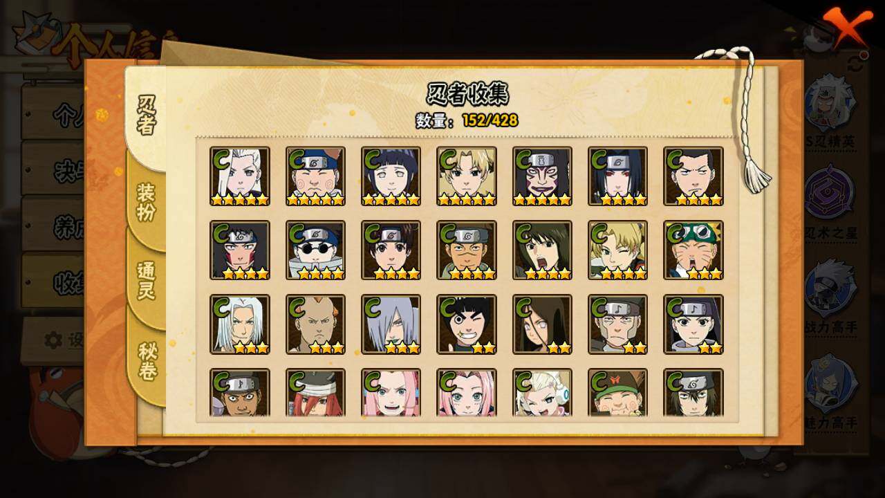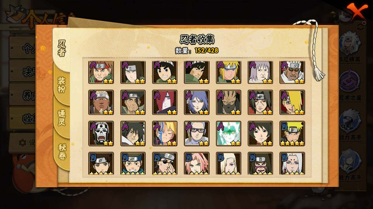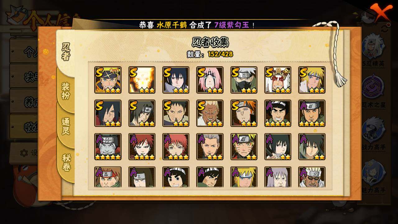 【S级忍者】:宇智波斑「秽土转生·解」(3星),春野樱「忍界大战」(3星),宇智波带土「忍界大战」(3星),艾「忍界大战」(3星),宇智波鼬「须佐能乎」(3星),旗木卡卡西「须佐能乎」(3星),自来也「舞之豪杰」(3星),波风水门(3星),漩涡鸣人「九喇嘛连结」(3星),佩恩「天道」(3星),宇智波佐助「永