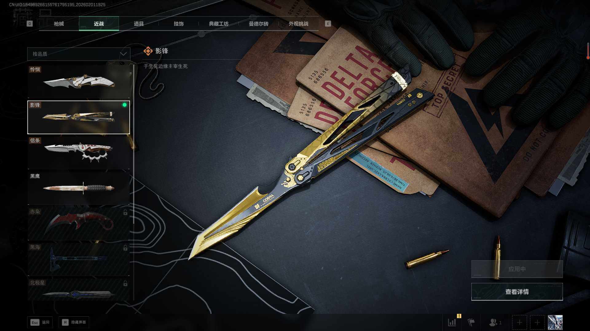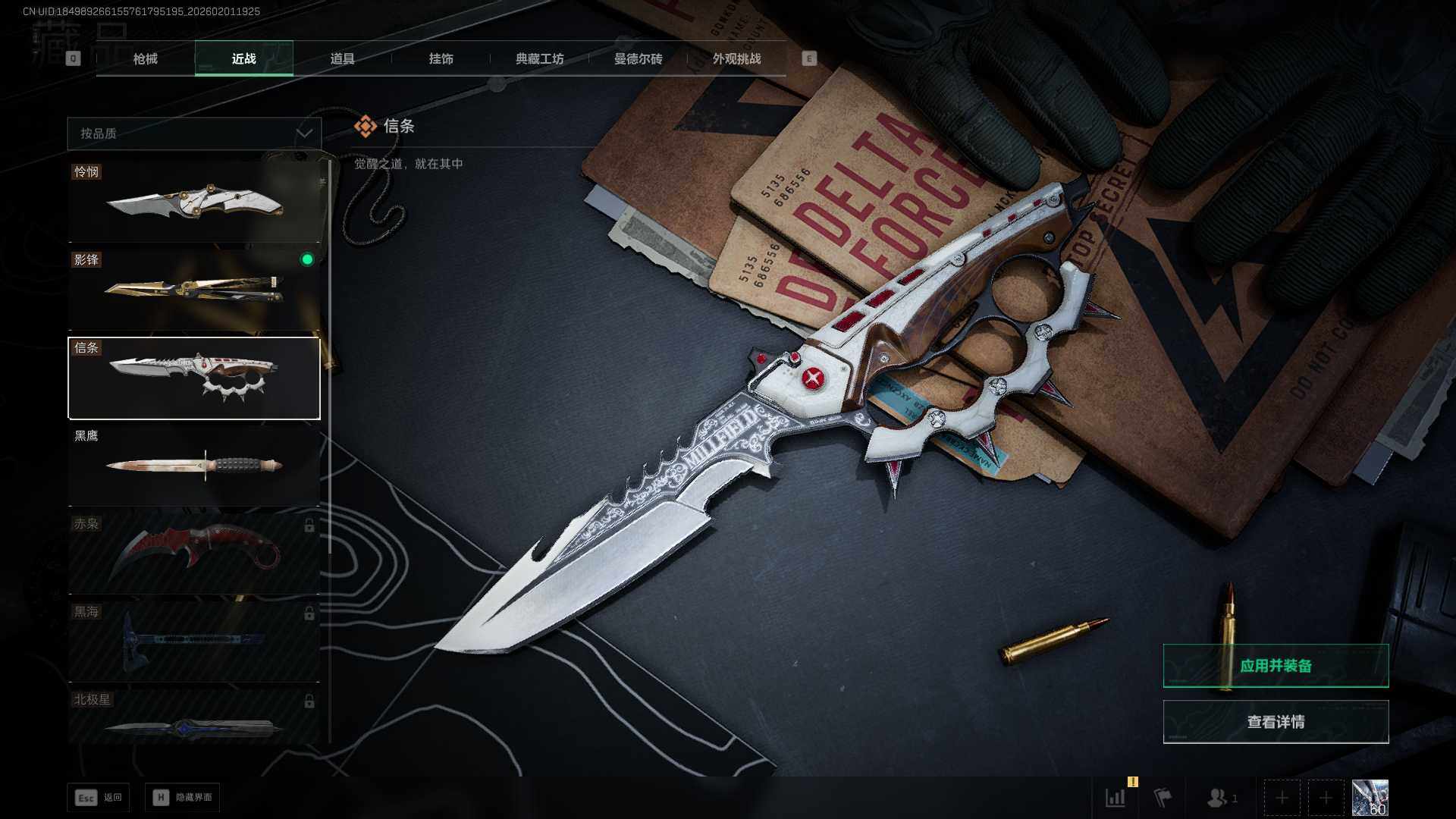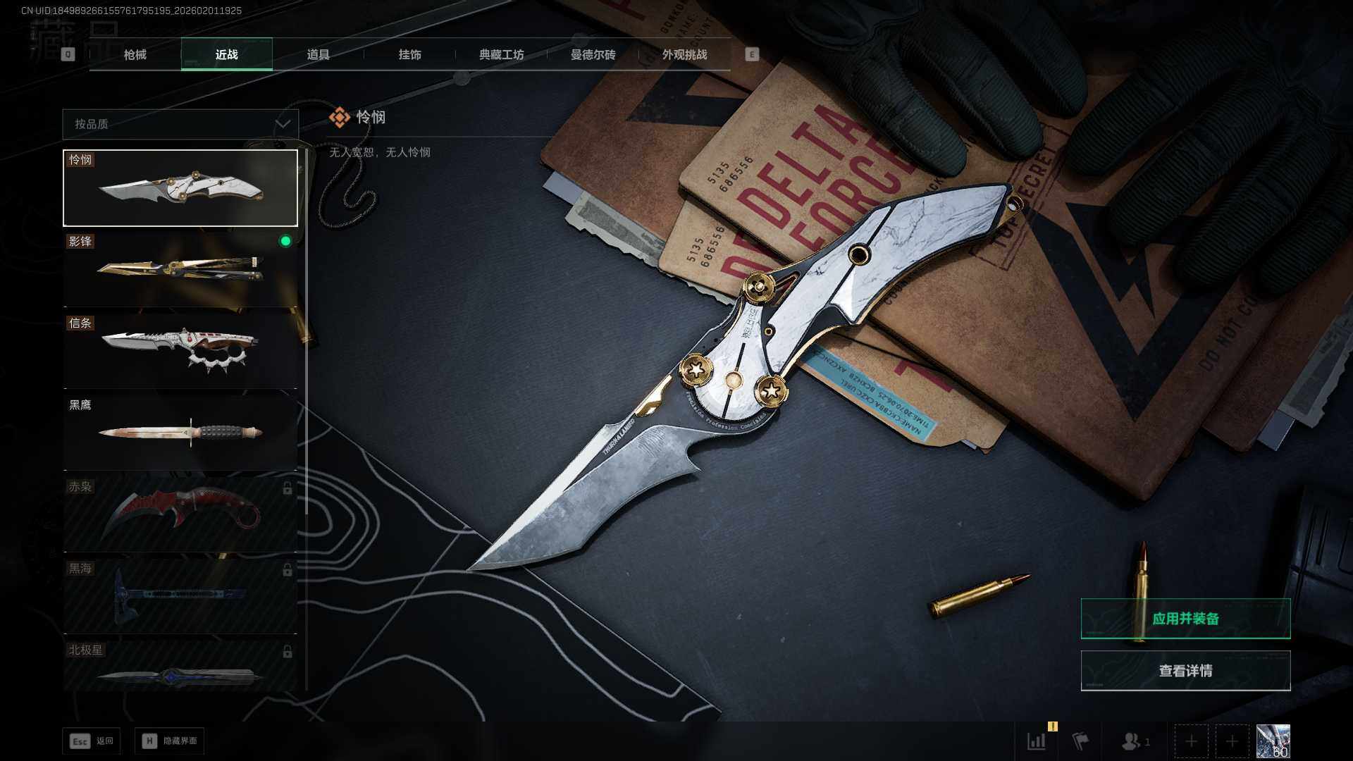 【近战皮肤】:近战-信条,近战-影锋,近战-怜悯,近战-黑鹰