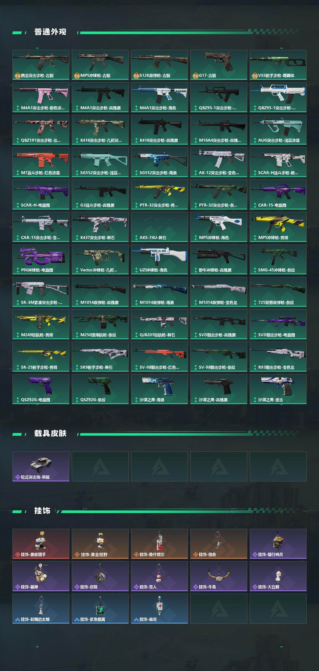 【传说外观】:M4A1突击步枪-阿米娅,ASh-12战斗步枪-鹅鸭杀,SG552突击步枪-运动员,SCAR-H战斗步枪-水墨云图,SCAR-H战斗步枪-启航,KC17突击步枪-电锯惊魂,P90冲锋枪-信条,Vector冲锋枪-能天使-午夜邮差,勇士冲锋枪-能天使-午夜邮差,QCQ171冲锋枪-鹅鸭杀,
