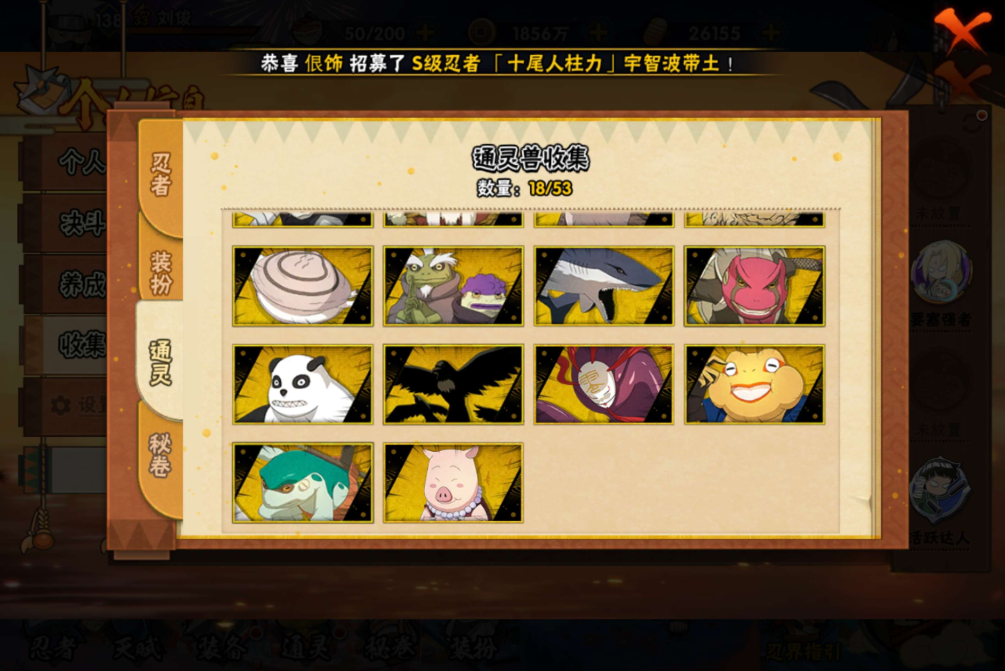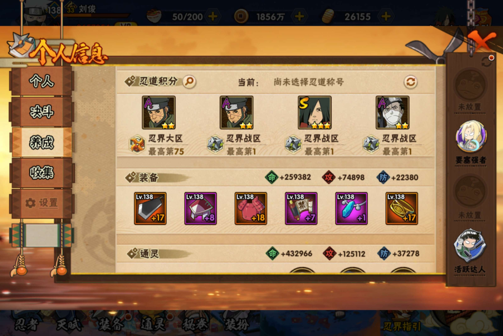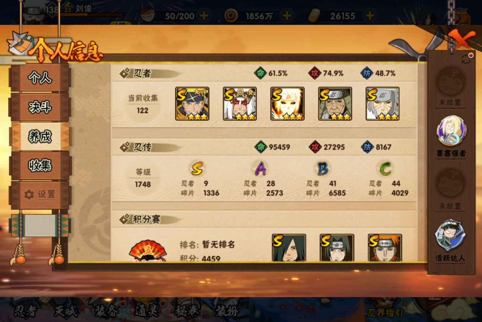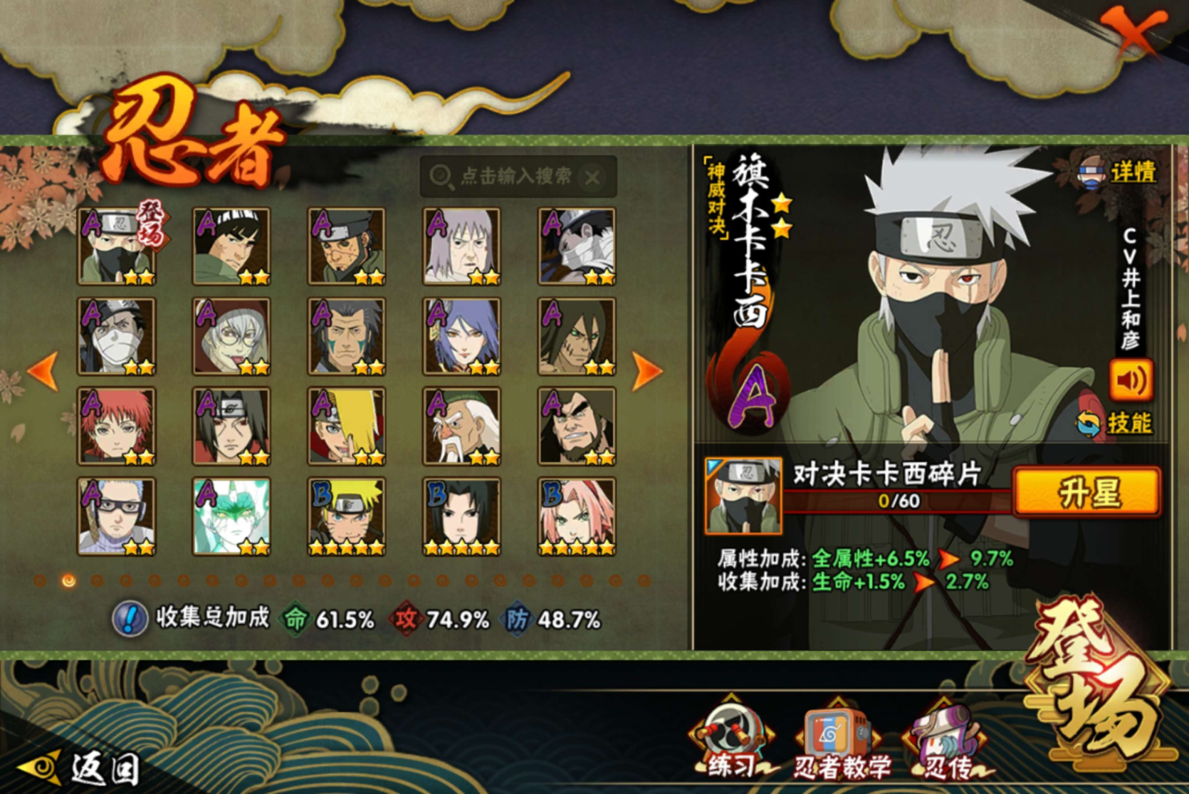 【S级忍者】宇智波斑「秽土转生·解」(3星),波风水门「九喇嘛连结」(3星),千手扉间「秽土转生」(3星),自来也「舞之豪杰」(3星),宇智波鼬「须佐能乎」(3星),漩涡