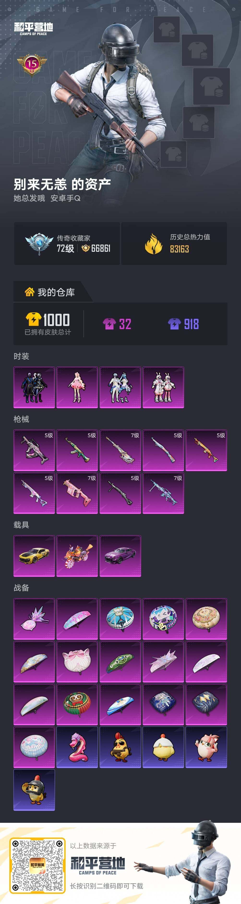 【特价出售/店主推荐】 安卓 手Q-4粉装-9特效枪-3载具-1粉色飞行器-8.3w热力值-15王牌印记-168套装-275枪皮【热门品类】:套装-龟仙人【粉色套装】:粉装-暗夜玫瑰,粉装-太空嘟嘟,粉装-未来歌姬,角色-樱桃泡泡【粉色枪皮等级】:AKM-绿萝繁花(五级),GROZA-镜光银凌(五级),Vector-飒粉甜心(七级),Kar98K-巳巳如意(五级),Mk14-甜梦熊击(五级),Mk14-福马献瑞(五级),AMR-智耀战神(七级),DP-28-豹影疾电(五级),MG-36-幻彩电音