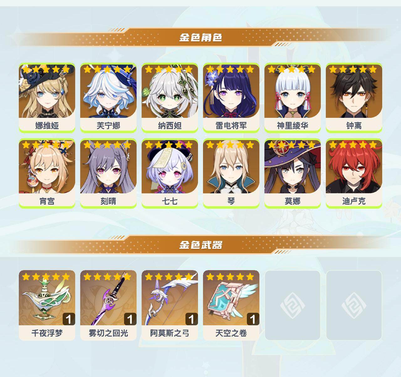 0命娜维娅,0命芙宁娜,0命纳西妲,0命雷电将军,0命神里绫华,0命钟离,0命宵宫,0命刻晴,0命七七,0命琴,0命莫娜,0命迪卢克,精1千夜浮梦,精1雾切之回光,精1阿莫斯之弓,精1天空之卷