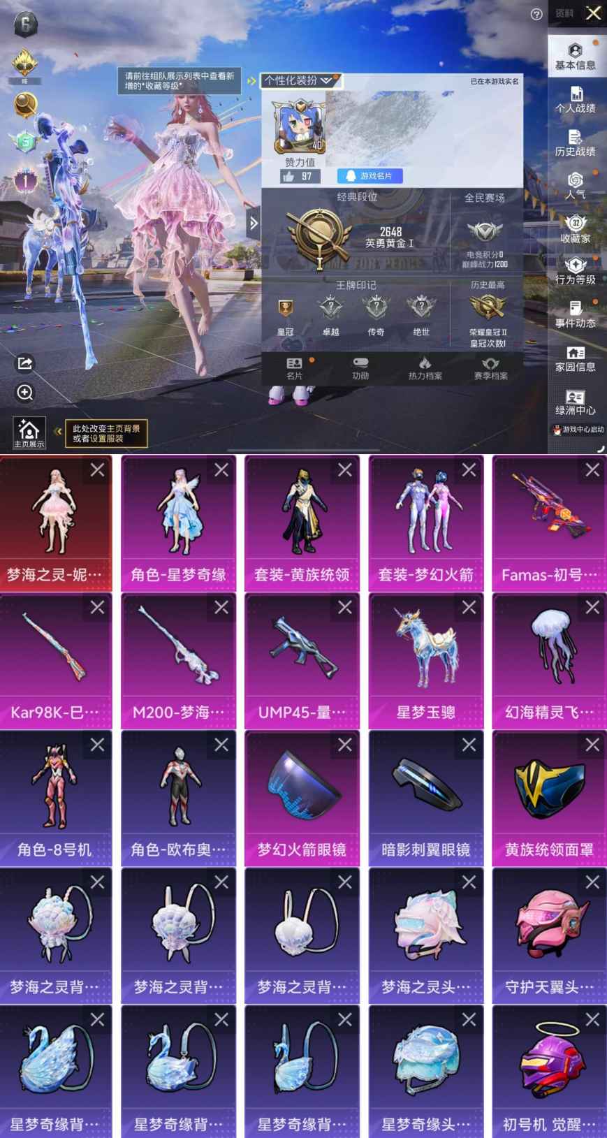 XS528【公主号1神装3粉4特1车 梦海之灵-妮芮妲1级 星梦玉骢 星梦奇缘 梦幻火箭 粉螳螂 M200-梦海之灵 (3级)Famas-觉醒初号机 (4级)幻海精灵飞行器】苹果Q-19902热力值 历史荣耀皇冠Ⅱ 41套装 57枪皮 【1载具】 星梦玉骢 【1神装】 梦海之灵-妮芮妲1级 【3粉装】 梦幻火箭 星梦奇缘 黄族统领 【4特效枪】 Famas-觉醒初号机 (4级) Kar98K-巳巳如意 (2级) M200-梦海之灵 (3级) UMP45-量子极限 (4级) 【2飞行器】 幻海精灵