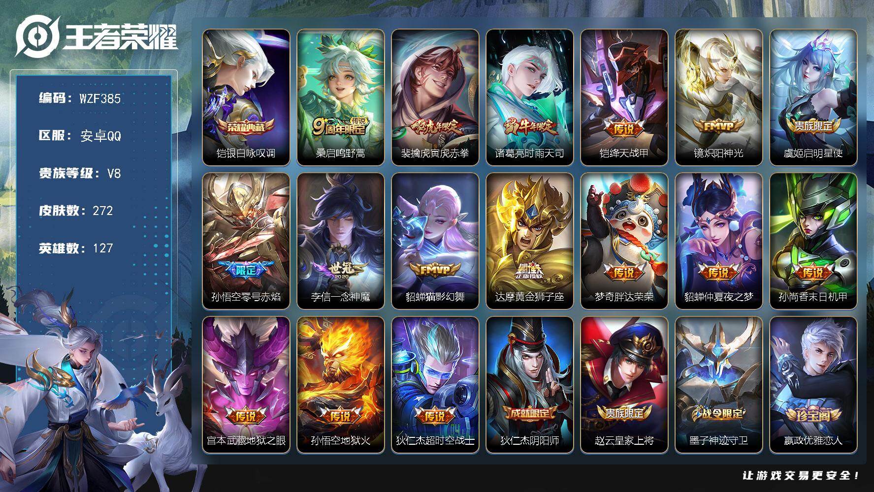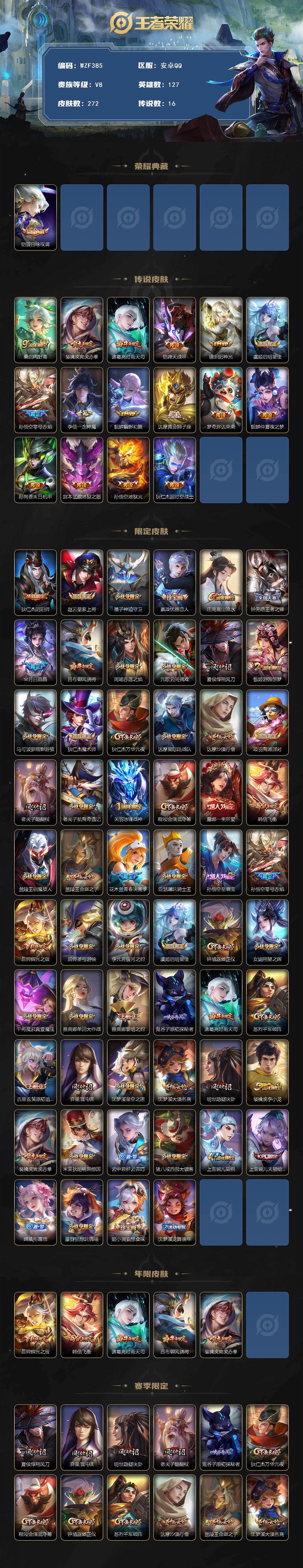 安卓Q-V8-永恒钻石IV段位-127英雄-272皮肤-1典藏皮肤-16传说-74史诗