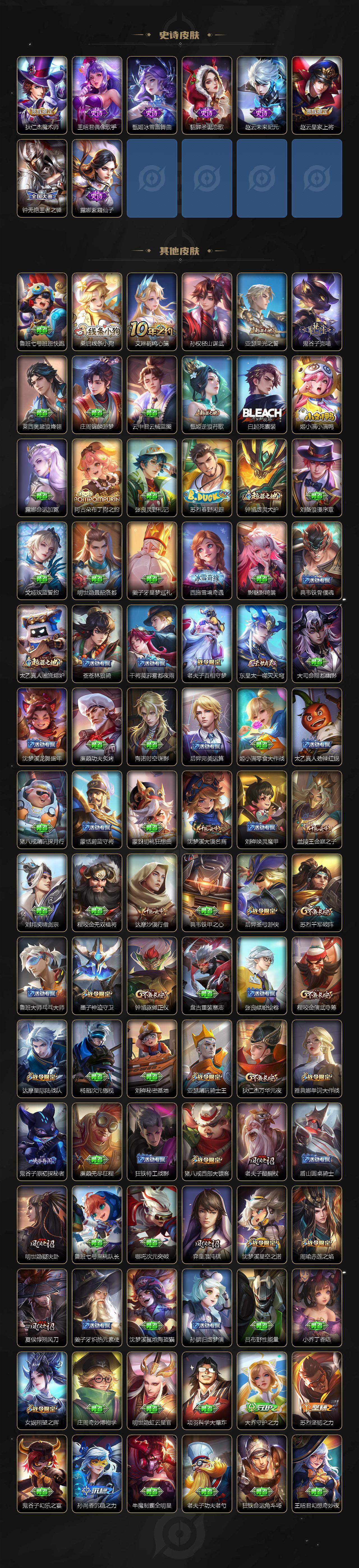 【限定皮肤】:狄仁杰阴阳师,赵云皇家上将,墨子神迹守卫,嬴政优雅恋人,庄周高山流水,钟无艳王者之锤,