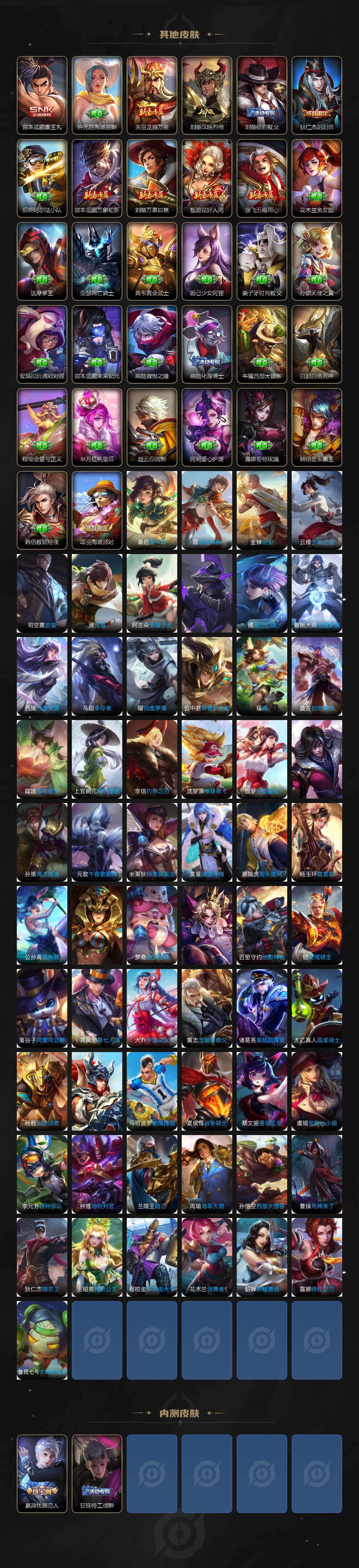 【传说皮肤】:桑启鸣野蒿,裴擒虎寅虎赤拳,诸葛亮时雨天司,铠绛天战甲,镜炽阳神光,虞姬启明星使,孙悟空零号赤焰,李信一念神魔,貂蝉猫影幻舞,达摩黄金狮子座,梦奇胖达荣荣,貂蝉仲夏夜之梦,孙尚香末日机甲,宫本武藏地狱之眼,孙悟空地狱火,狄仁杰超时空战士