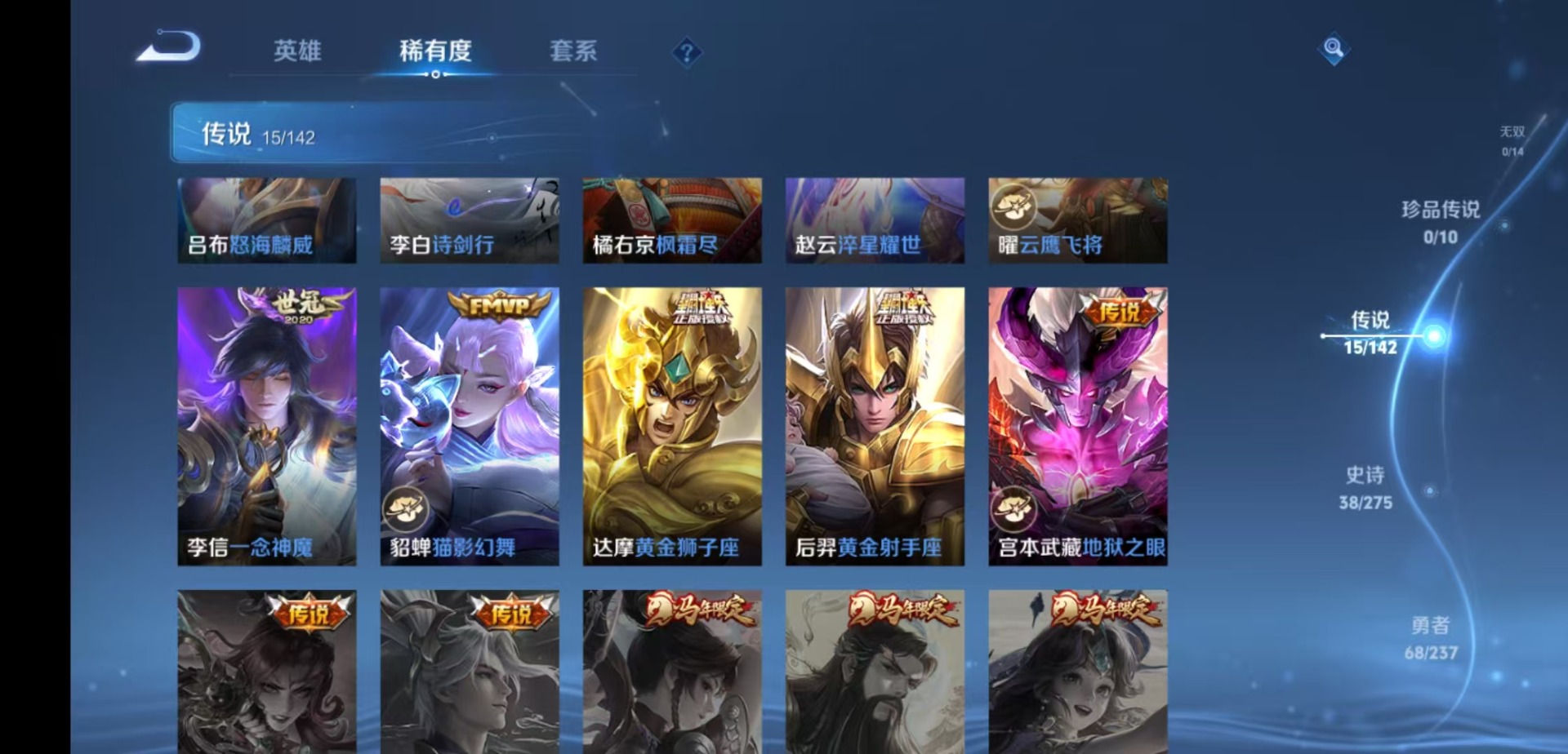 【传说皮】幻光神枪,神树通天,黄金狮子座,黄金射手座,地狱之眼,一念神魔,淬星耀世,猫影幻舞,云鹰飞将(小将军),电玩·雷克斯