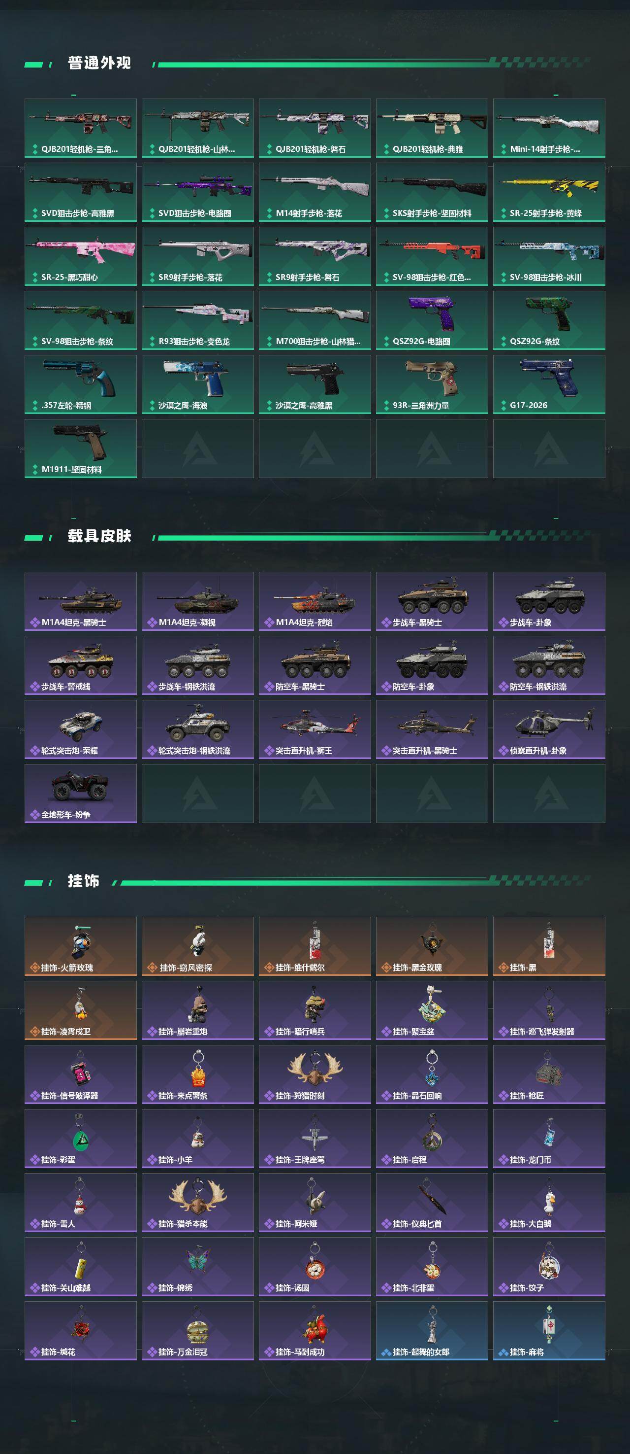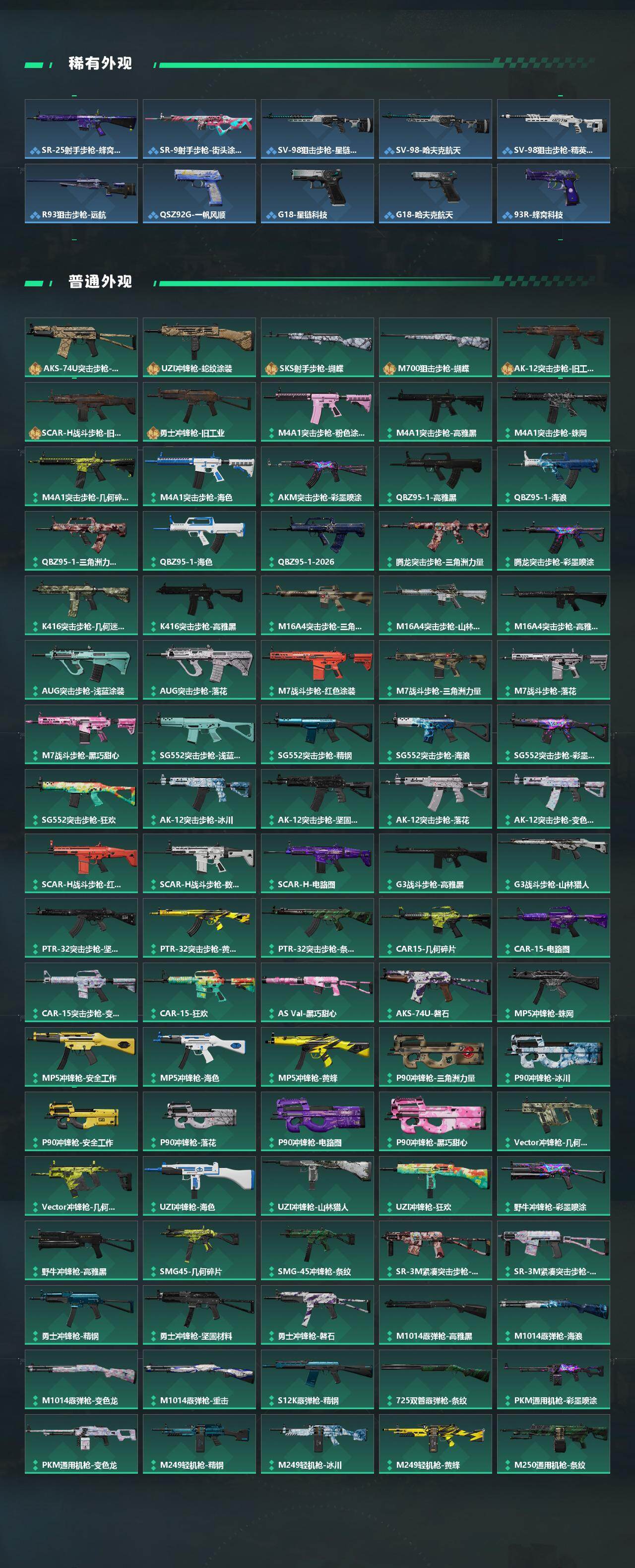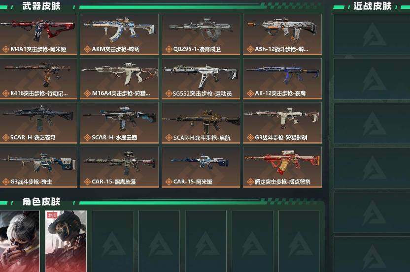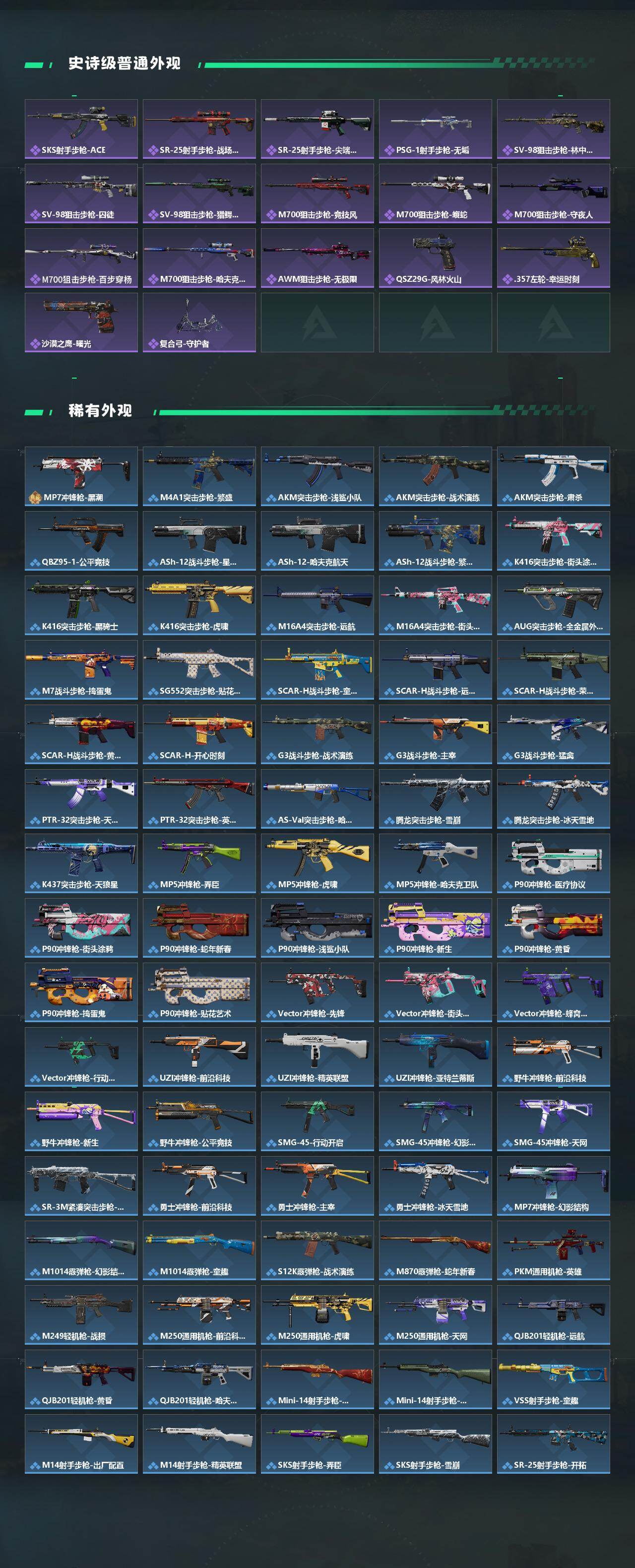 【传说外观】:M4A1突击步枪-阿米娅,AKM突击步枪-锦绣,QBZ95-1突击步枪-凌霄戍卫,ASh-12战斗步枪-鹅鸭杀,K416突击步枪-行动记录,M16A4突击步枪-狩猎时刻,SG552突击步枪-运动员,AK-12突击步枪-夜鹰,SCAR-H战斗步枪-铁艺苍穹,SCA