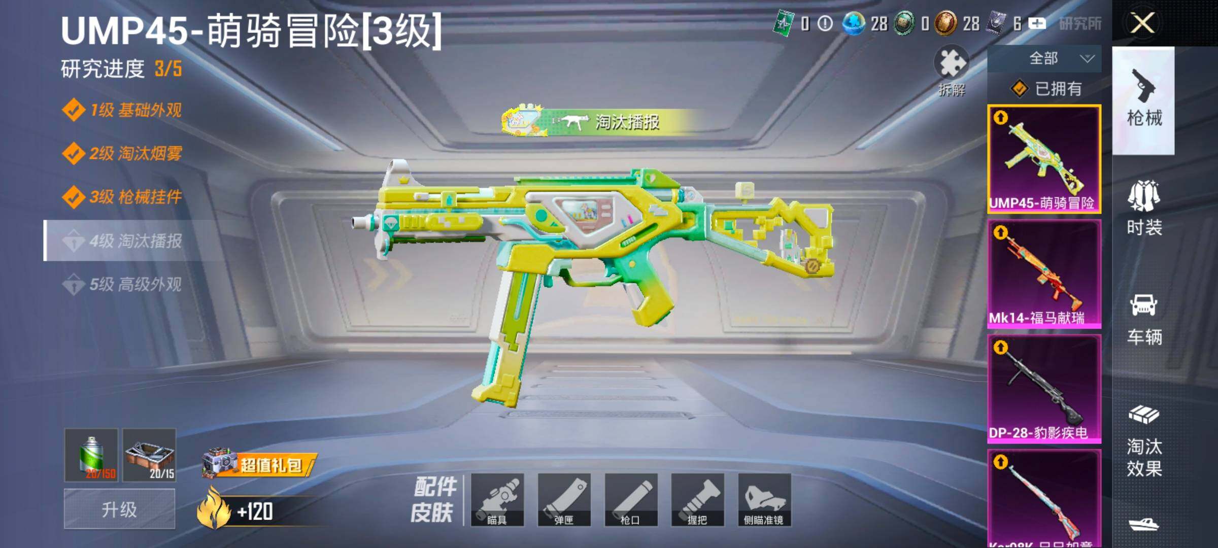 【4特效枪】 Kar98K-巳巳如意 (5级) DP-28-豹影疾电 (5级) Mk14-福马献瑞 (5级) UMP45-萌骑冒险 (3级)